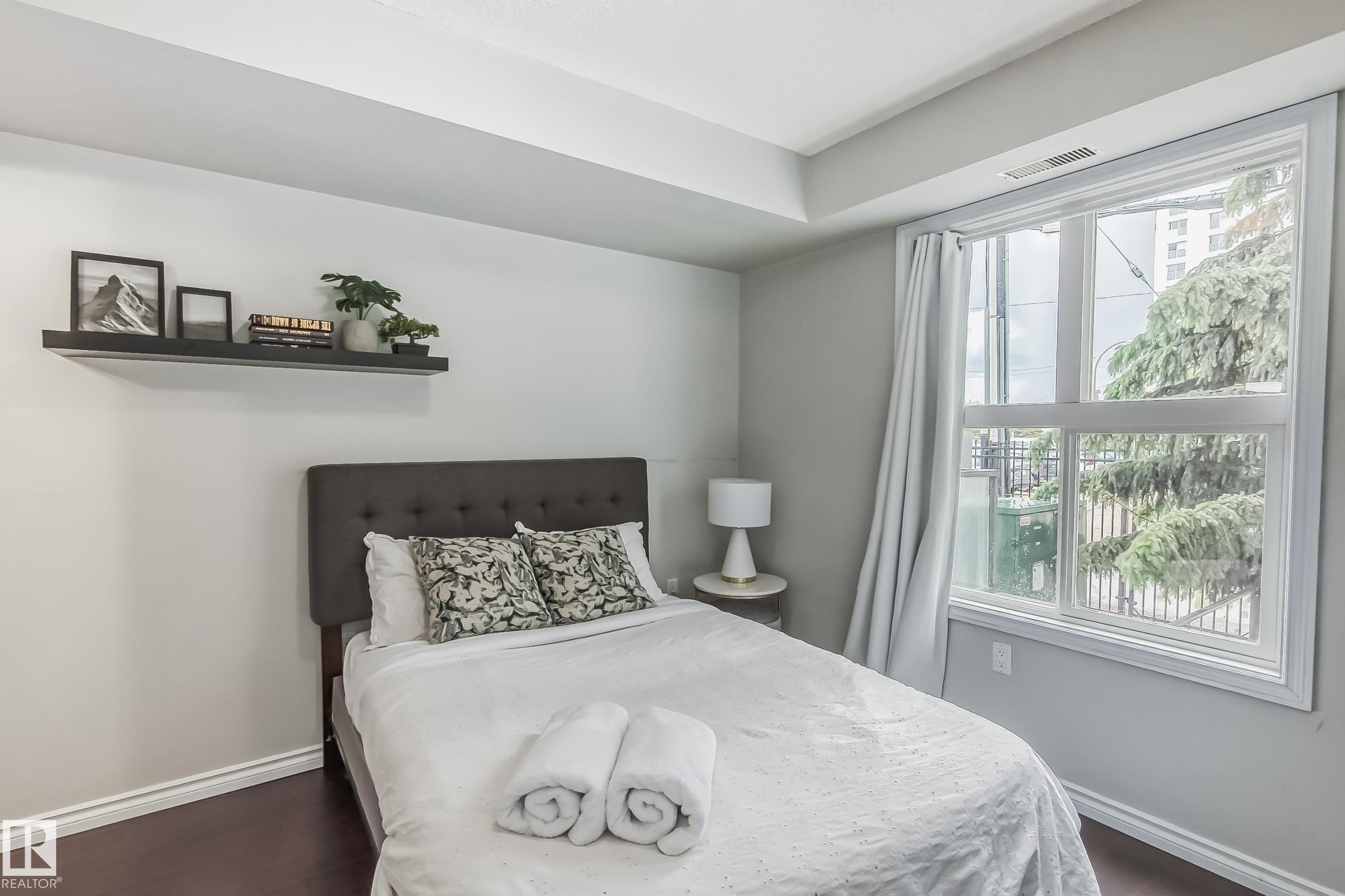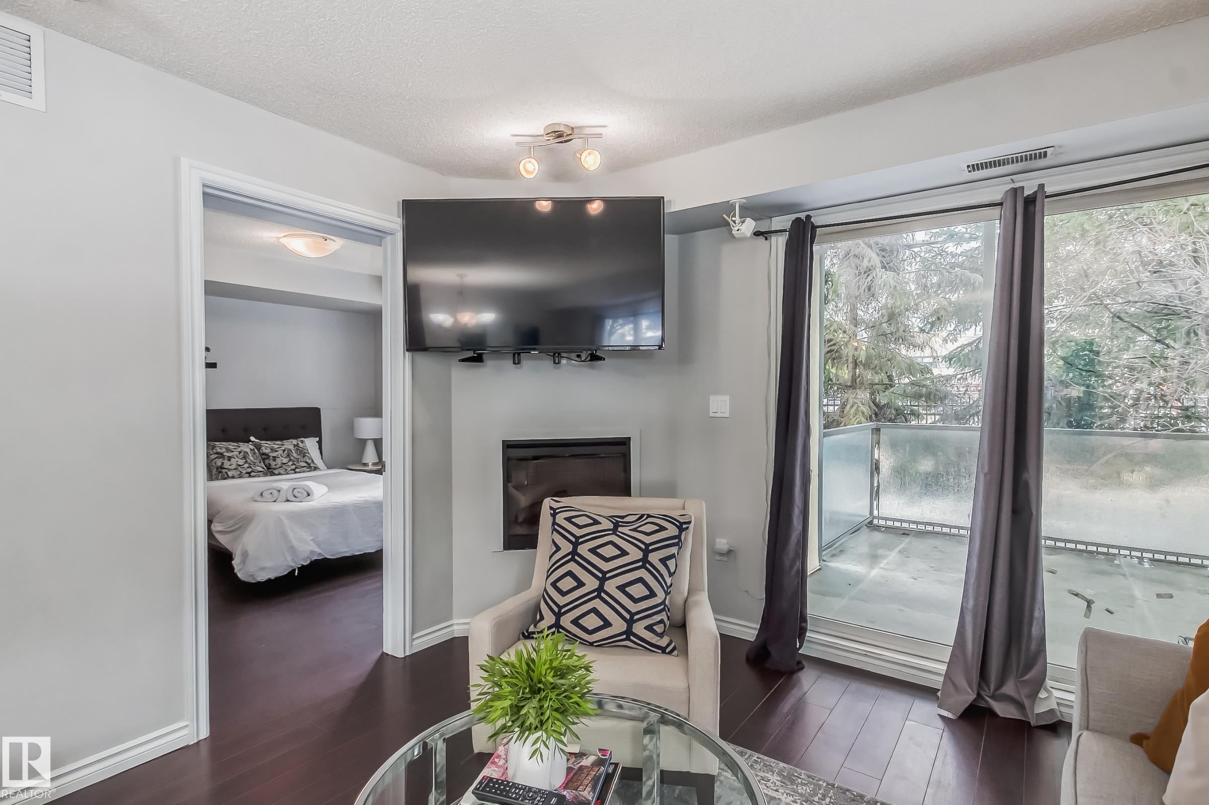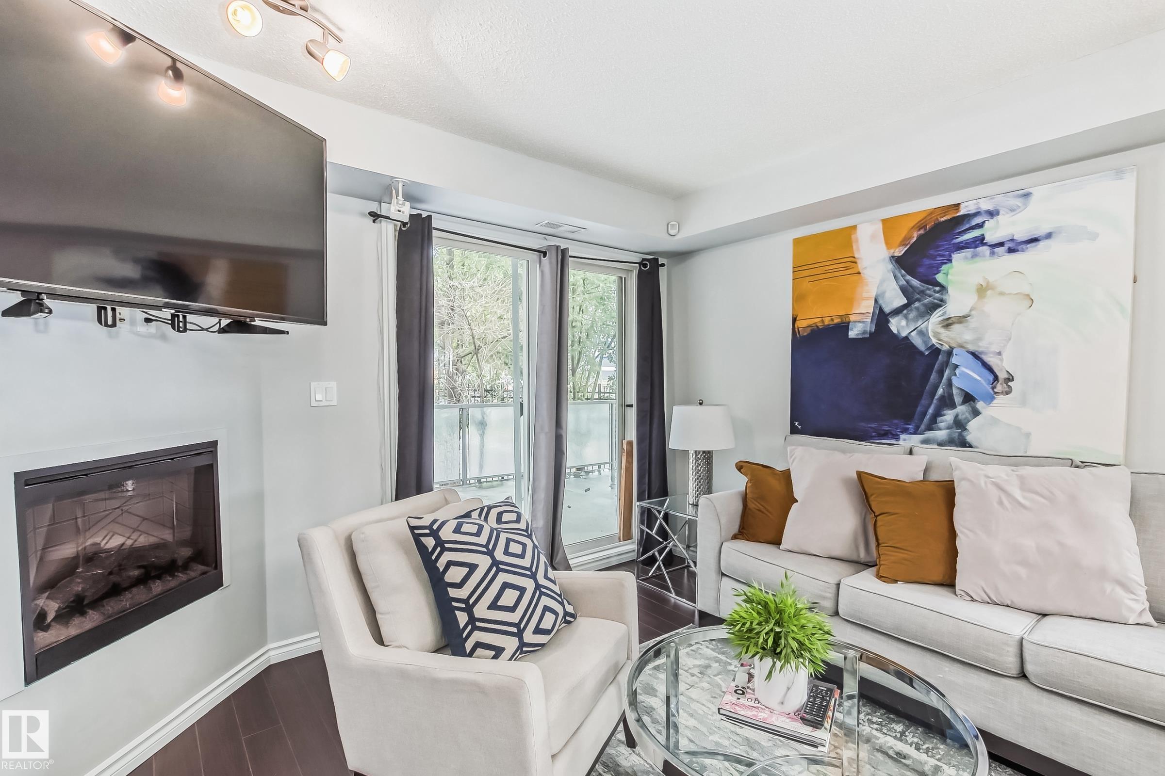 This cozy, 2 bed/2 bath, 854 sq ft unit is well lit with natural light due to its private corner location. It features A/C, a fireplace, stainless steel appliances, as well as a large wrap-around patio that is great for outdoor living and enjoying the city views. Your new home awaits in a vibrant neighborhood surrounded by the Ice District/Rogers Place Arena, MacEwan University, the LRT, and popular dining spots like the Lingnan, & Brew and Bloom. Additionally, the property offers heated underground parking; a valuable feature during the winter months in Edmonton. This property is popular due to its location and proximity to amenities. Come take a look!