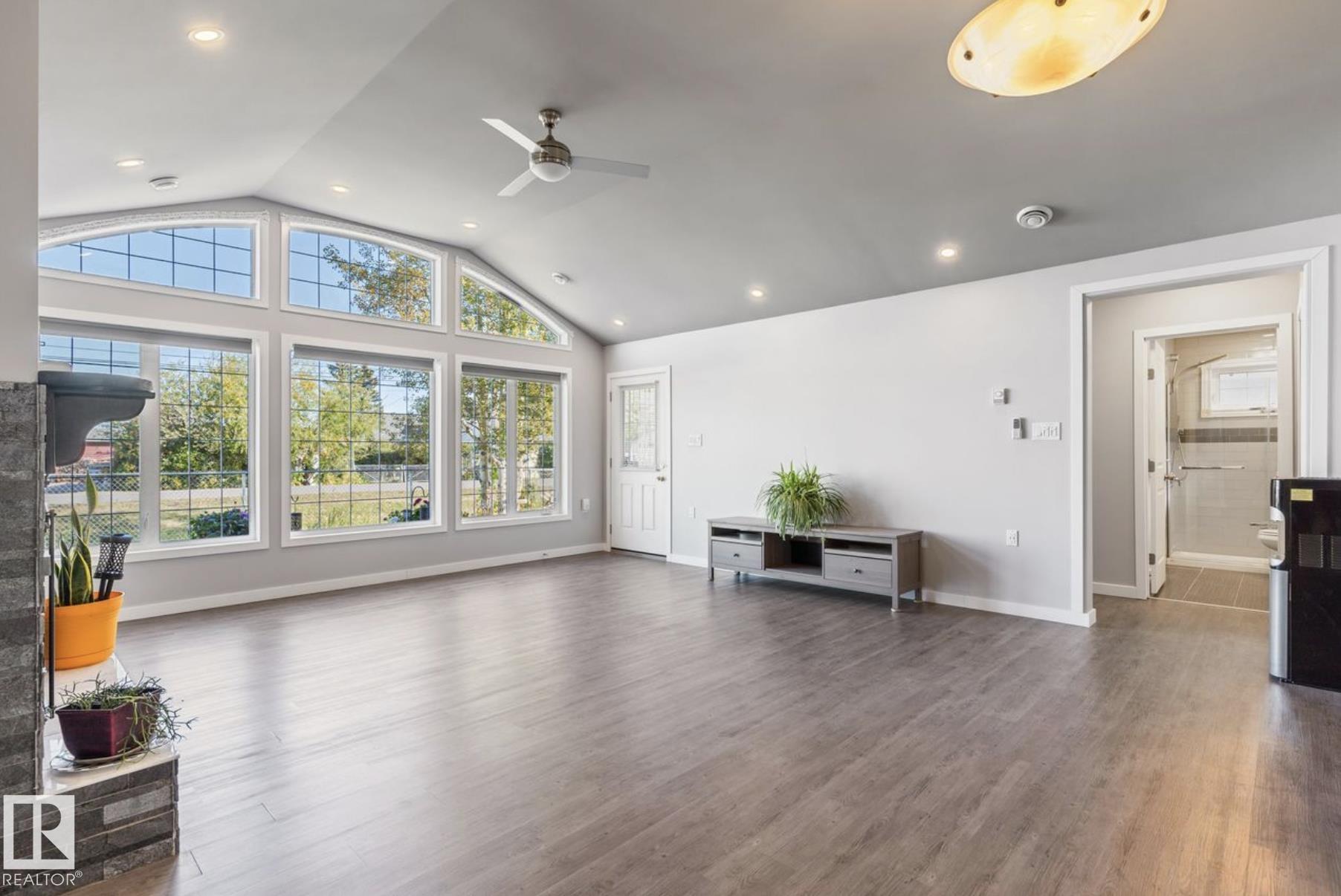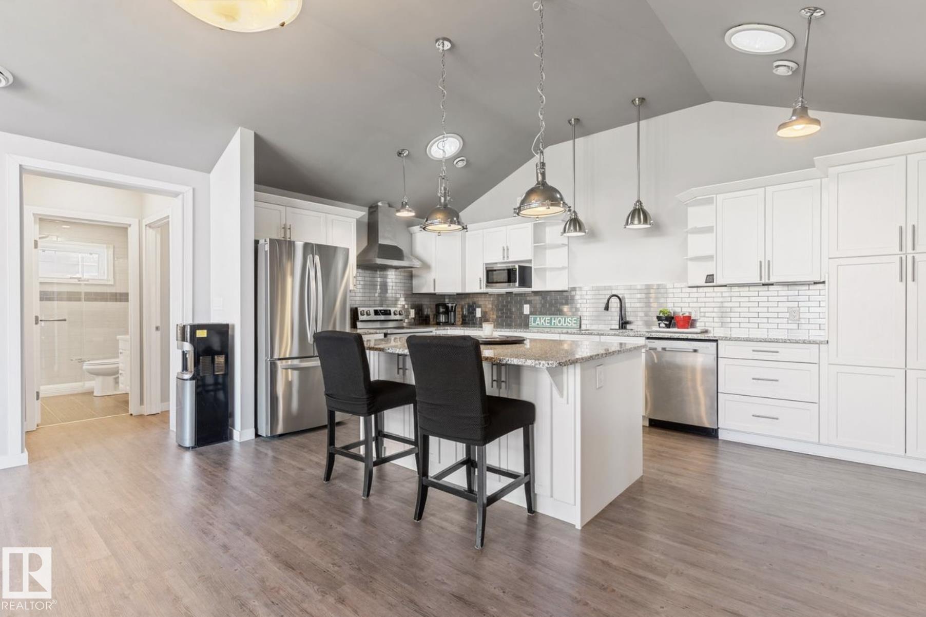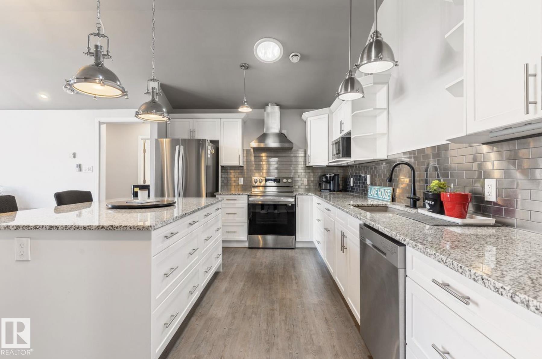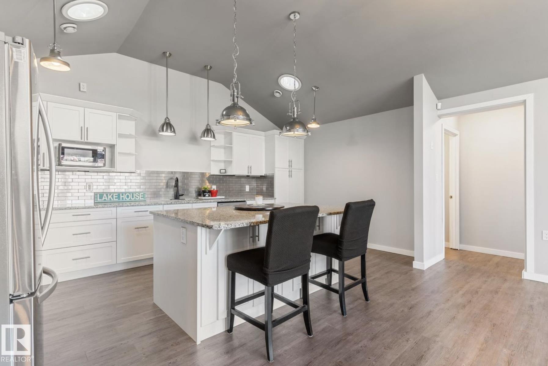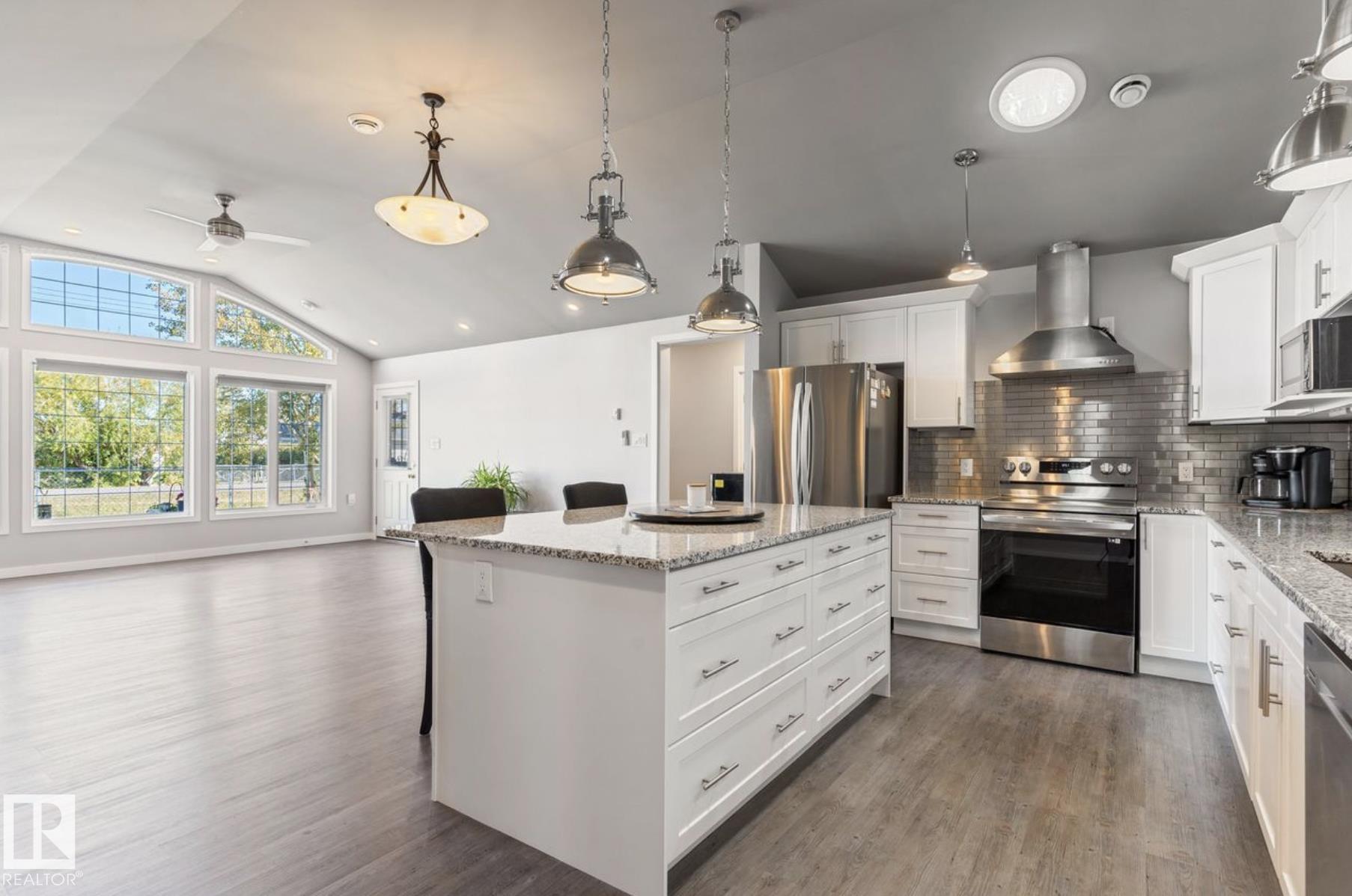 This stunning 2017-built bungalow in Val Quentin combines modern elegance with lakeside charm, offering 2 spacious bedrooms, 2 bathrooms, and a garden suite with its own washroom above the oversized double garage. Set on a large, beautifully landscaped lot with lake views and RV parking, the home features an immaculate open-concept design with vaulted ceilings and massive windows that fill the living, dining, and kitchen spaces with natural light. The kitchen impresses with granite countertops, a large island, stainless steel appliances, and a custom industrial steel backsplash with matching lighting. With its pristine condition, versatile garden suite, RV space, and serene setting, this property is truly a rare find.