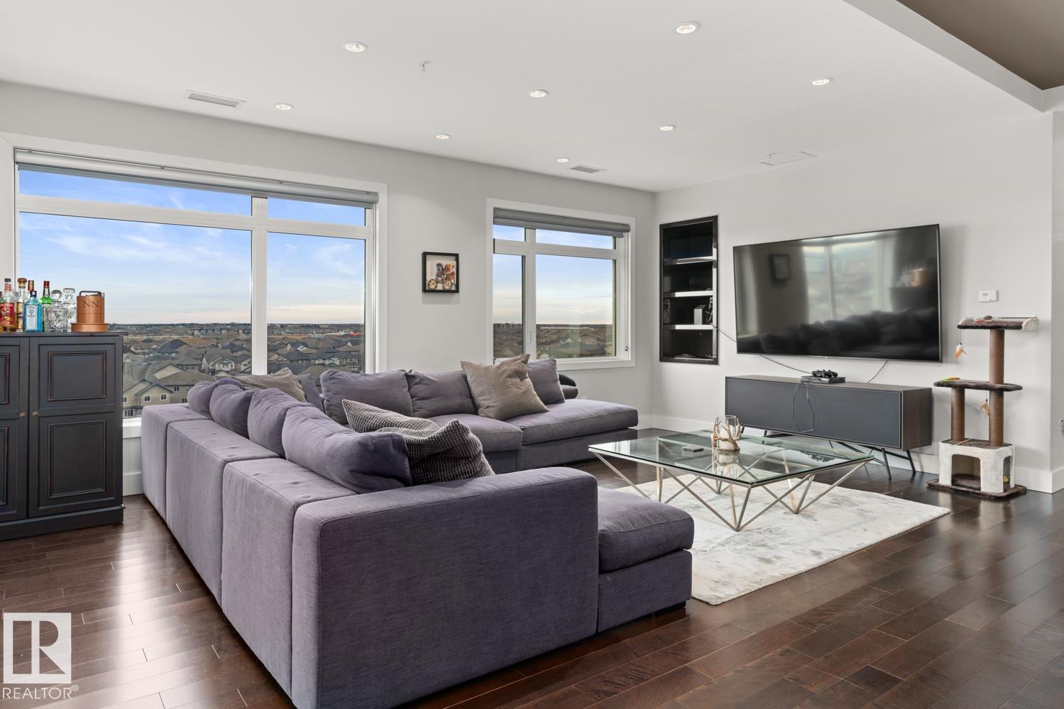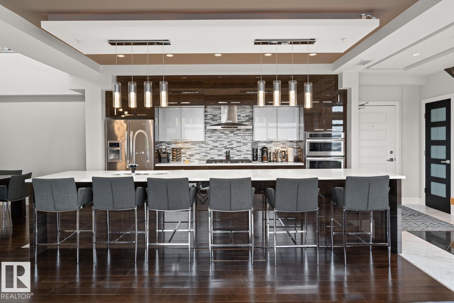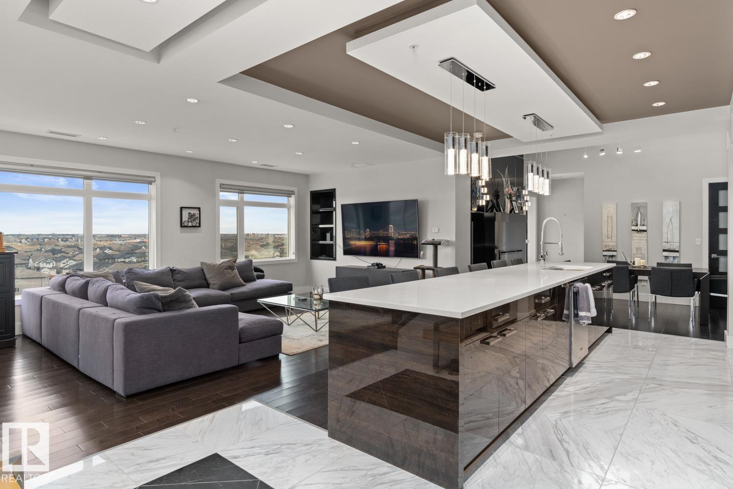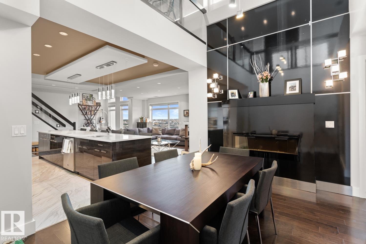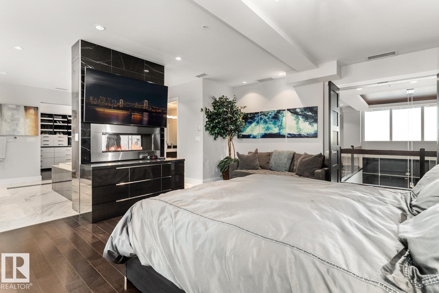 Welcome to the pinnacle of luxury living in Windermere! This stunning penthouse offers a sophisticated loft-style design with panoramic city views from two private balconies. The chef-inspired kitchen boasts a massive island with eating bar, modern finishes, and high-end appliances?perfect for entertaining. The open-concept living space is bright and inviting, while the main floor also features a den plus a bedroom with walk-through closet and private ensuite. Upstairs, the lavish master suite impresses with a double-sided fireplace, jet tub, steam shower, water closet, and an oversized walk-in closet. Two additional bedrooms and a laundry room complete the upper level. With two titled parking stalls and access to a fully equipped fitness centre, this penthouse is the perfect blend of elegance, comfort, and convenience in one of Edmonton?s most desirable communities. Don?t miss your chance to call this exceptional penthouse home!
