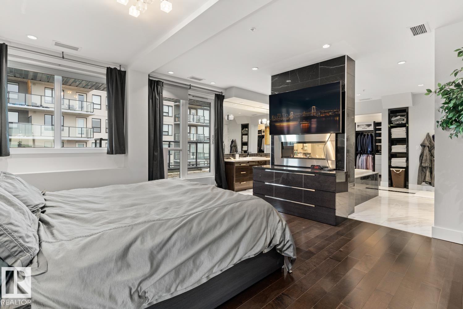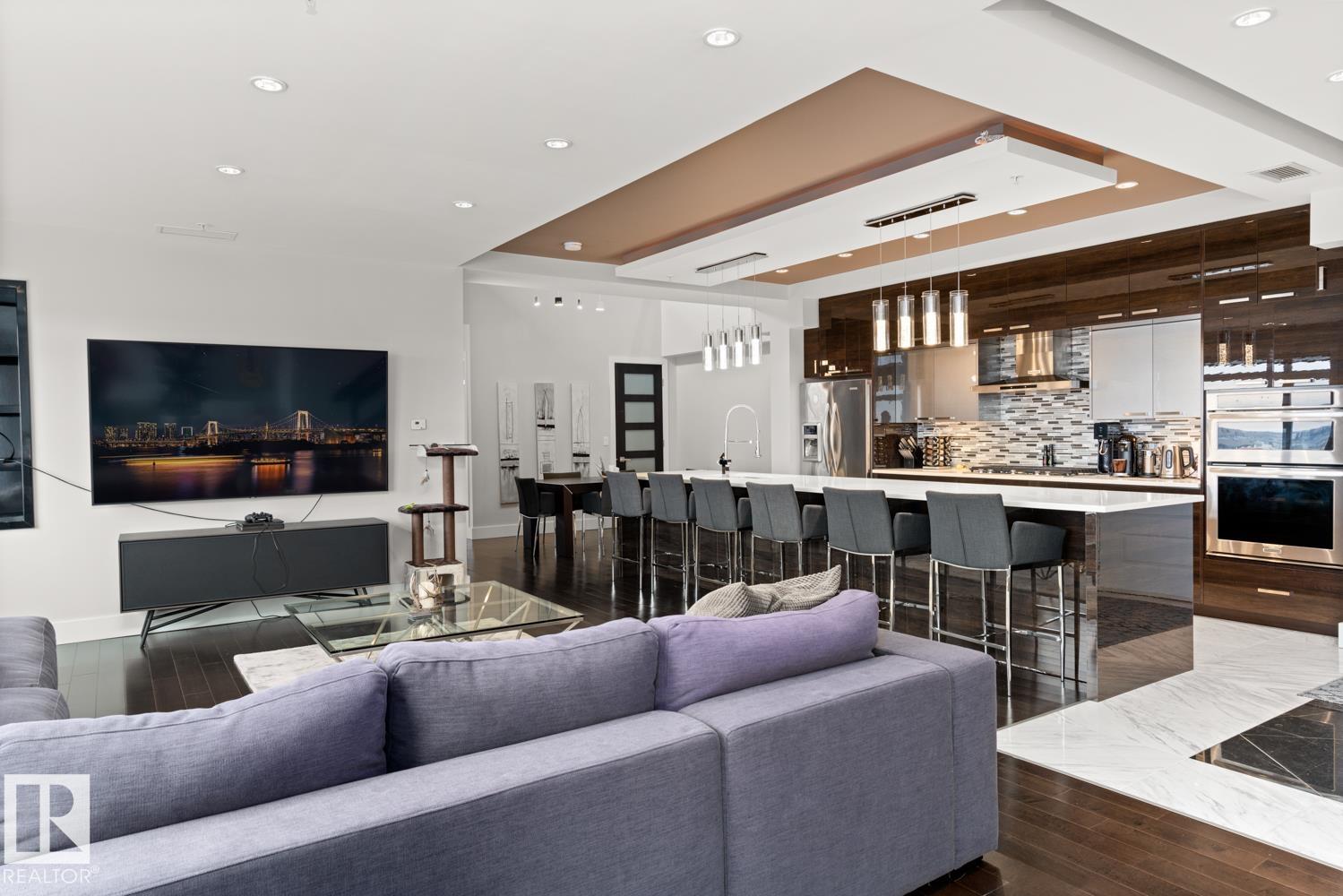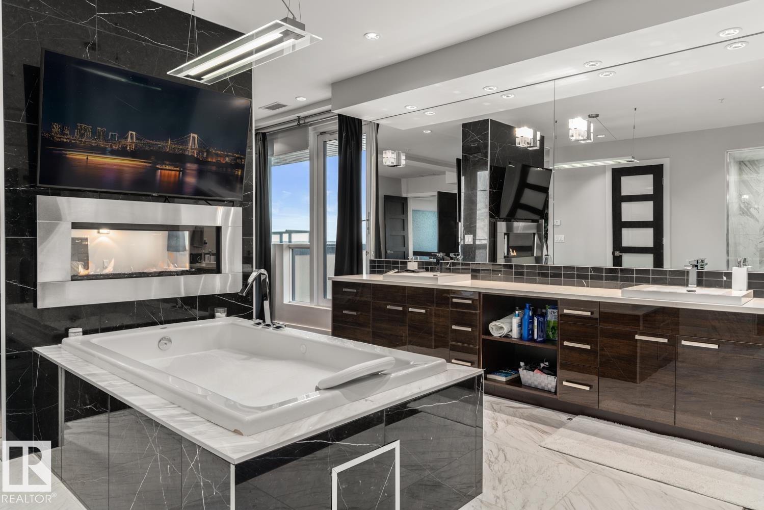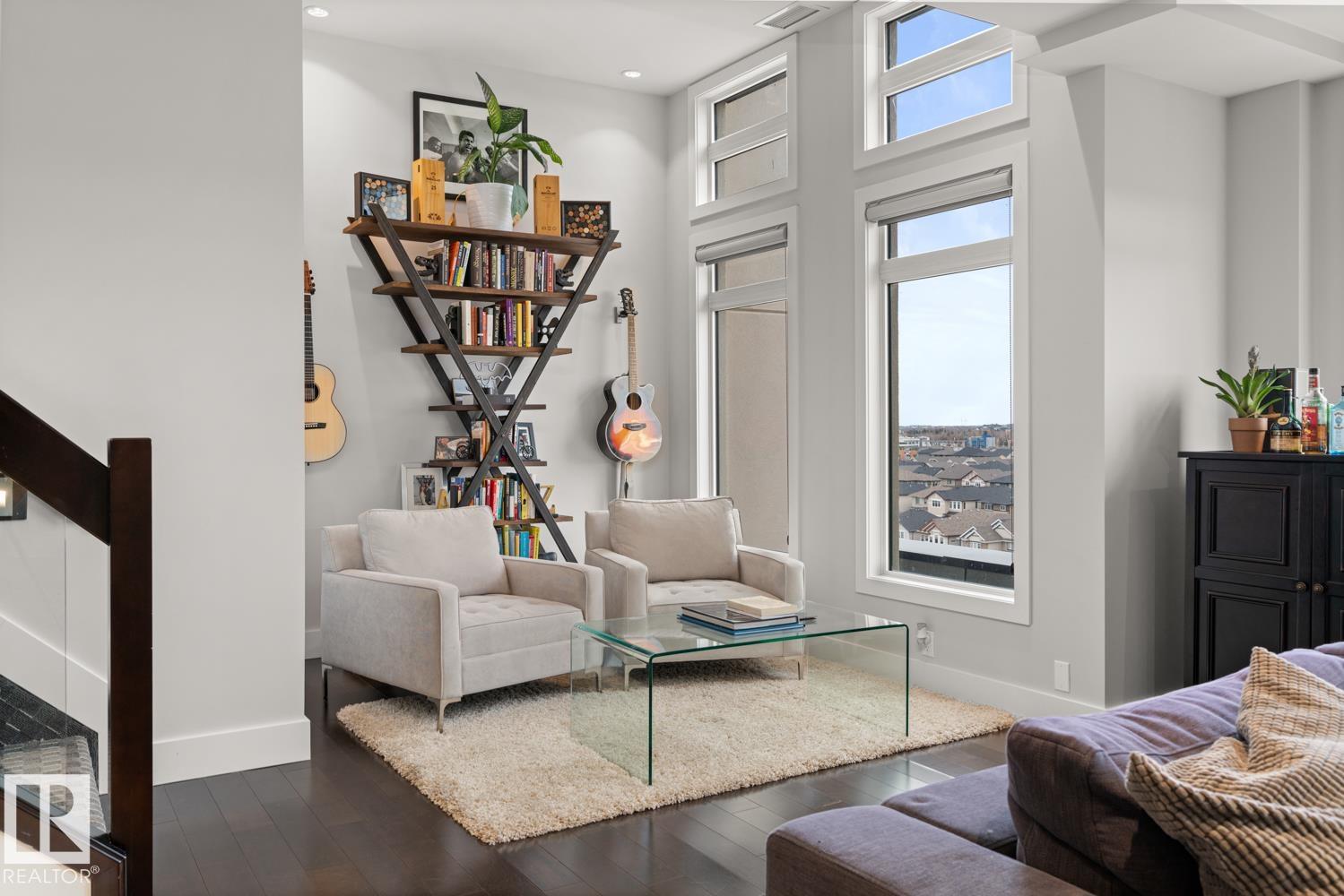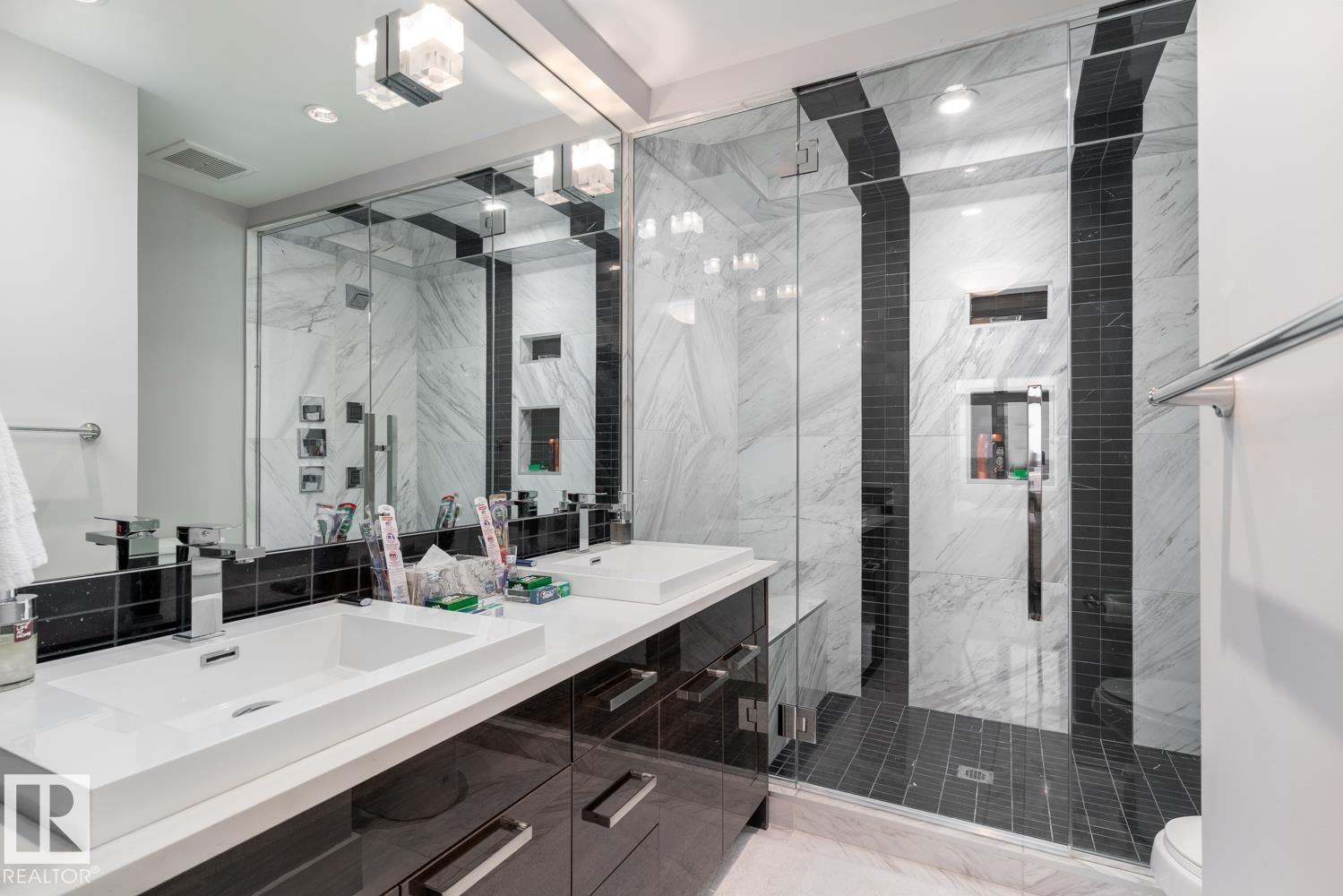 Welcome to the pinnacle of luxury living in Windermere! This stunning penthouse offers a sophisticated loft-style design with panoramic city views from two private balconies. The chef-inspired kitchen boasts a massive island with eating bar, modern finishes, and high-end appliances?perfect for entertaining. The open-concept living space is bright and inviting, while the main floor also features a den plus a bedroom with walk-through closet and private ensuite. Upstairs, the lavish master suite impresses with a double-sided fireplace, jet tub, steam shower, water closet, and an oversized walk-in closet. Two additional bedrooms and a laundry room complete the upper level. With two titled parking stalls and access to a fully equipped fitness centre, this penthouse is the perfect blend of elegance, comfort, and convenience in one of Edmonton?s most desirable communities. Don?t miss your chance to call this exceptional penthouse home!