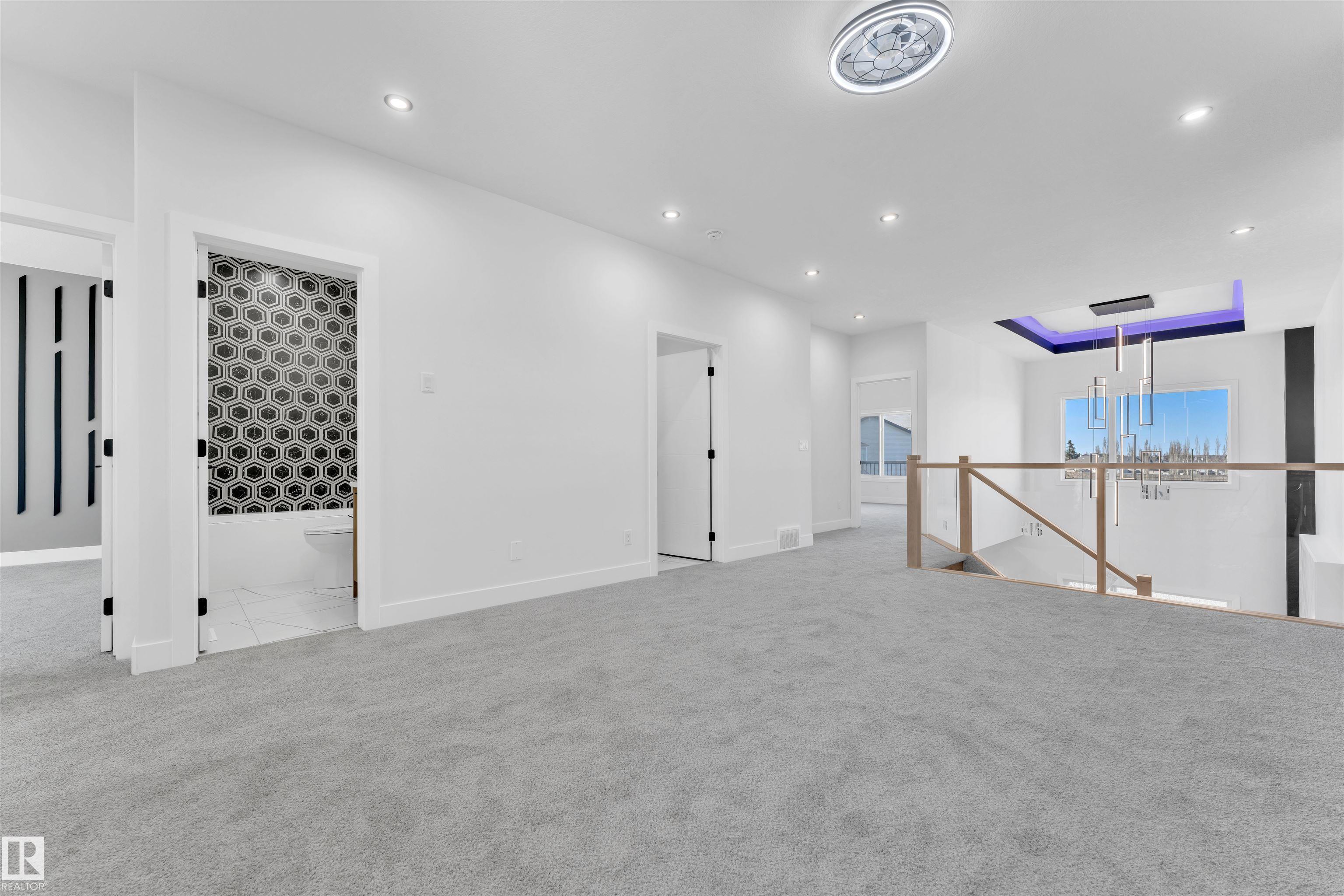 Step into luxury with this fully upgraded custom WALKOUT double car garage home BACKING TO Green Space ! The main floor features a spacious den and a stylish half bath for added convenience. The chef-inspired kitchen is a true masterpiece, complete with a unique center island and a pantry for ample storage. The open-concept living area showcases a custom feature wall, while the adjacent dining space offers direct access to the FULL SIZE DECK ideal for entertaining. The upper level you will find a spacious bonus room. Grand primary suite with a stunning feature wall, a 5-piece ensuite with custom finishes, a large walk-in closet & BALCONY. Two additional bedrooms with their own walk in closet & common bathroom. Laundry is conveniently located upstairs. The unfinished WALKOUT basement offers endless potential for your personal touch. This home is a true masterpiece, don?t miss your chance to make it yours!