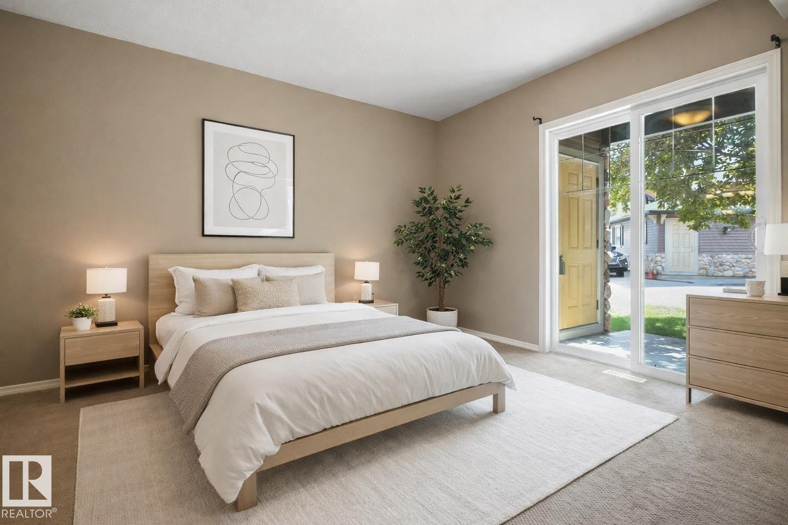 This executive chalet style bungalow is unique in that it has 3 bedrooms - 2 up and 1 in the fully finished basement, with just OVER 1800 sq ft of Living Space! With a cozy living room on the main floor and a large family room down complete with full theatre setup/equipment, there is plenty of room for entertaining. The kitchen not only has an eat up bar, but a huge pantry. For those BBQ lovers, there is a covered patio right off the living room and Primary bedroom. The location within the community is nice and quiet backing green space and the ravine. The overall location is ideally located close to shopping, public transportation right there, the Meadows Rec Centre 5 mins away and great for commuters being so close to both the Whitemud and the Anthony Henday. There is an option to rent additional parking if needed. With low condo fees, no age restriction and pet friendly this is a wise investment.
