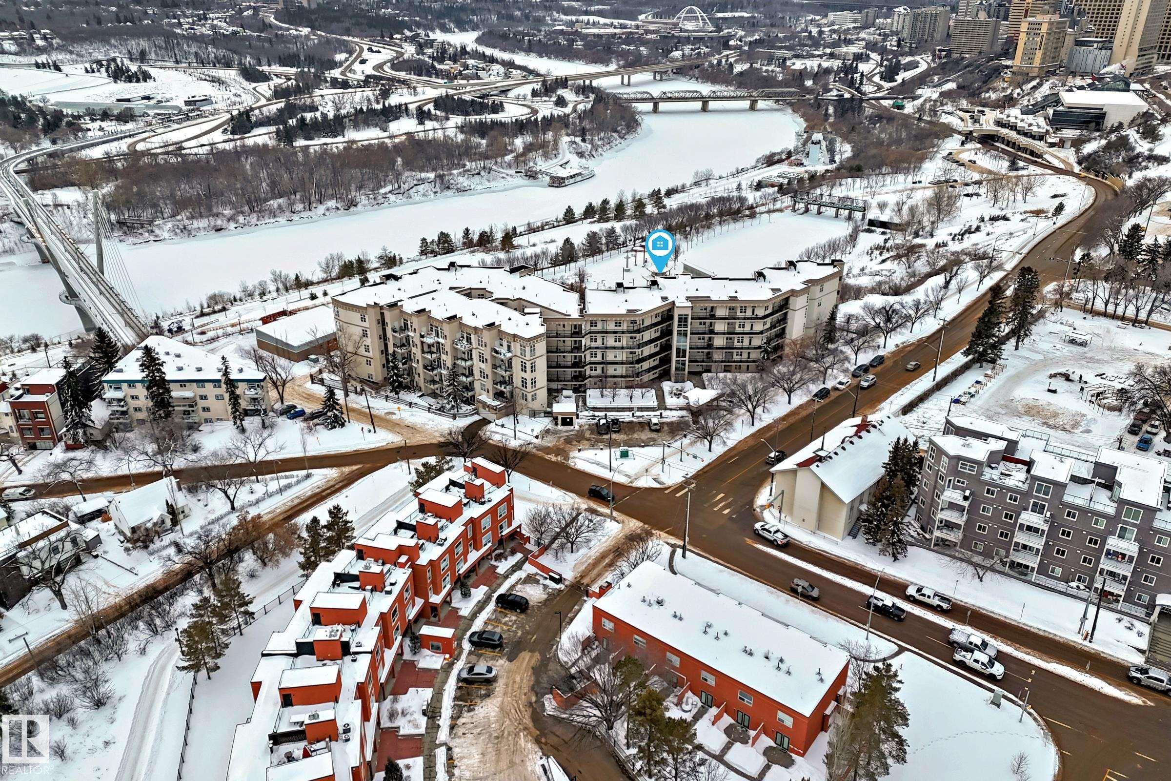 CENTRAL LIVING AT ITS FINEST! Welcome to this gorgeous, luxury two-bedroom condo unit in the incredibly desirable neighbourhood of Riverdale! This condo gives you walking access to all the great amenities within downtown Edmonton, while sitting perched right on the North Sask River Valley. Walk through the front door and you will be blown away by the front to back sight-lines and 9 foot ceilings throughout. The kitchen is a chef's dream including 9-foot island with raised breakfast bar, ample white cabinetry, gas range and more! Adjacent dining room is a fantastic space to host your dinner parties. The living room is spacious & bright with access to southwest facing patio featuring stunning river valley & downtown views. The primary bedroom is your own personal oasis with walk-in closet and 4-piece ensuite. Second bedroom is also a very good size, with 3-piece main bathroom just outside the door. Unit also features in-suite laundry, air conditioning, TWO titled underground parking stalls, and much more!