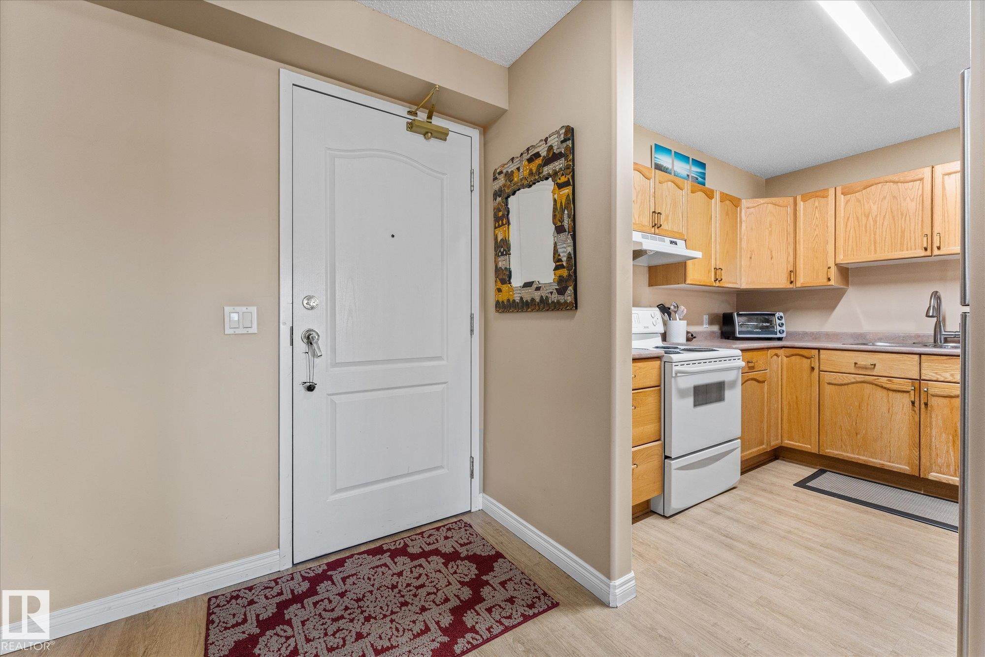 Enjoy comfortable, low-maintenance living in this bright and well-maintained 55+ condo in the desirable Kingswood neighbourhood, just minutes from the Servus Recreation Centre, scenic walking trails, and quick access to the Anthony Henday. The open-concept layout features vinyl plank flooring throughout, spacious kitchen with eating bar, inviting dining area, and a bright living room with access to a private balcony with natural gas hookup. Thoughtful design and wide spaces make the unit functional and easy to navigate, with the entire unit designed to be wheelchair accessible. The generous primary suite easily accommodates a king-size bed and has convenient access to the full ensuite with an oversized 6' soaker tub. Additional highlights include a versatile den space, in-suite laundry, heated underground parking with storage located near the elevator. Residents enjoy excellent amenities including a party room, games area, library, and guest suite for visitors, and condo fees include heat and water.