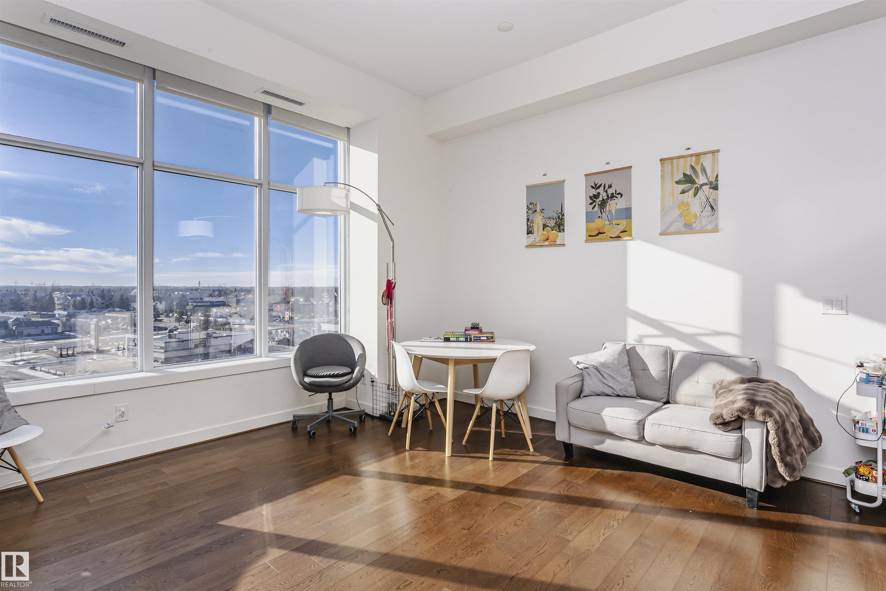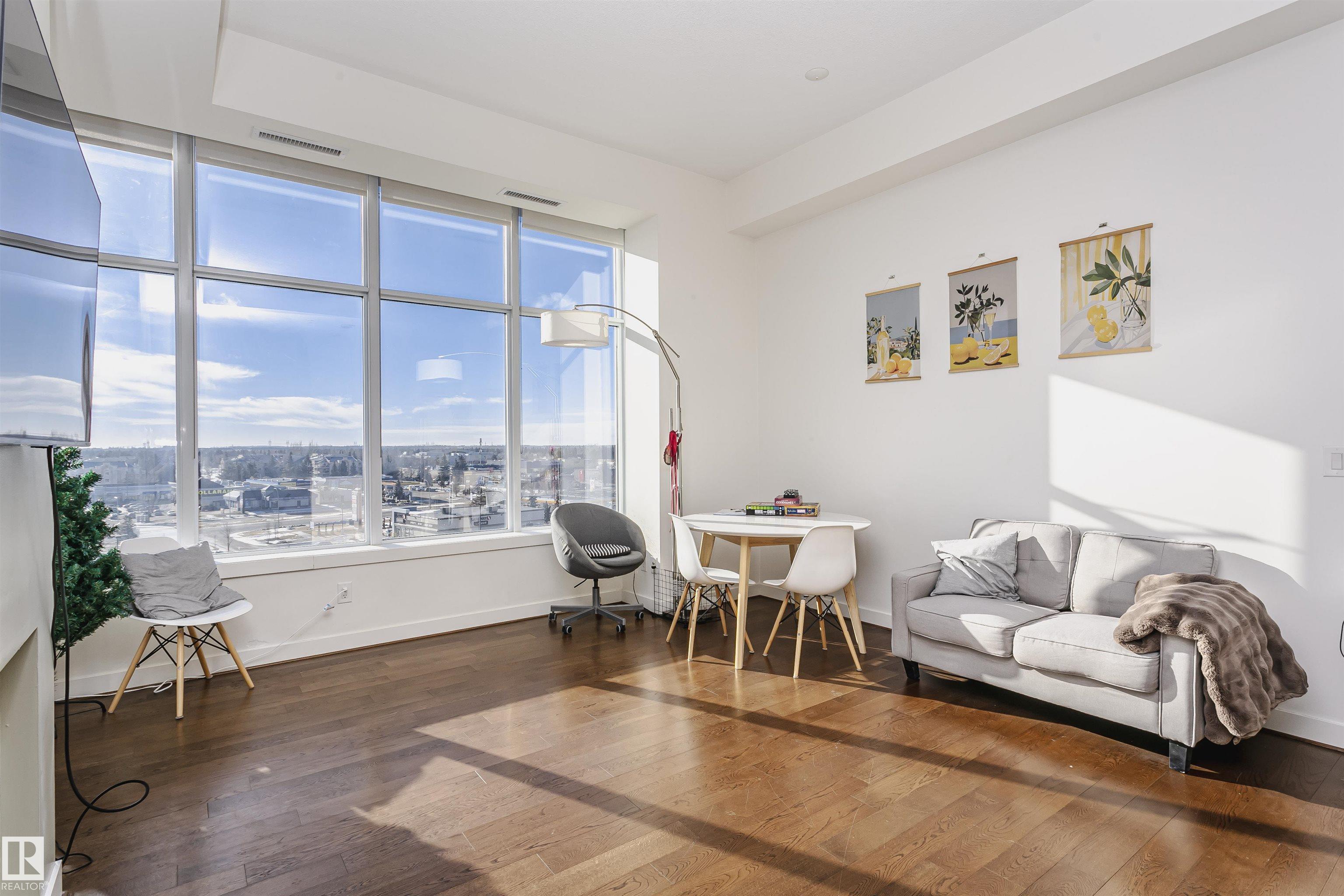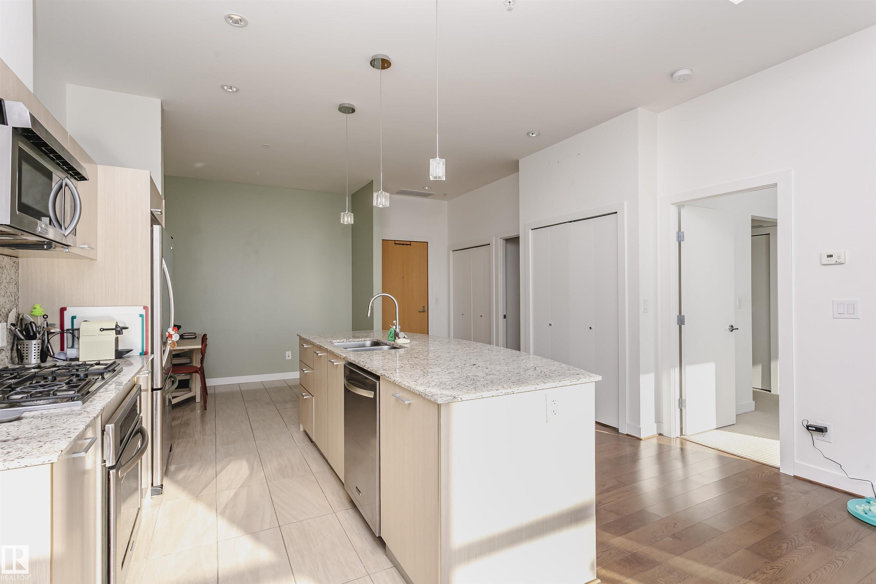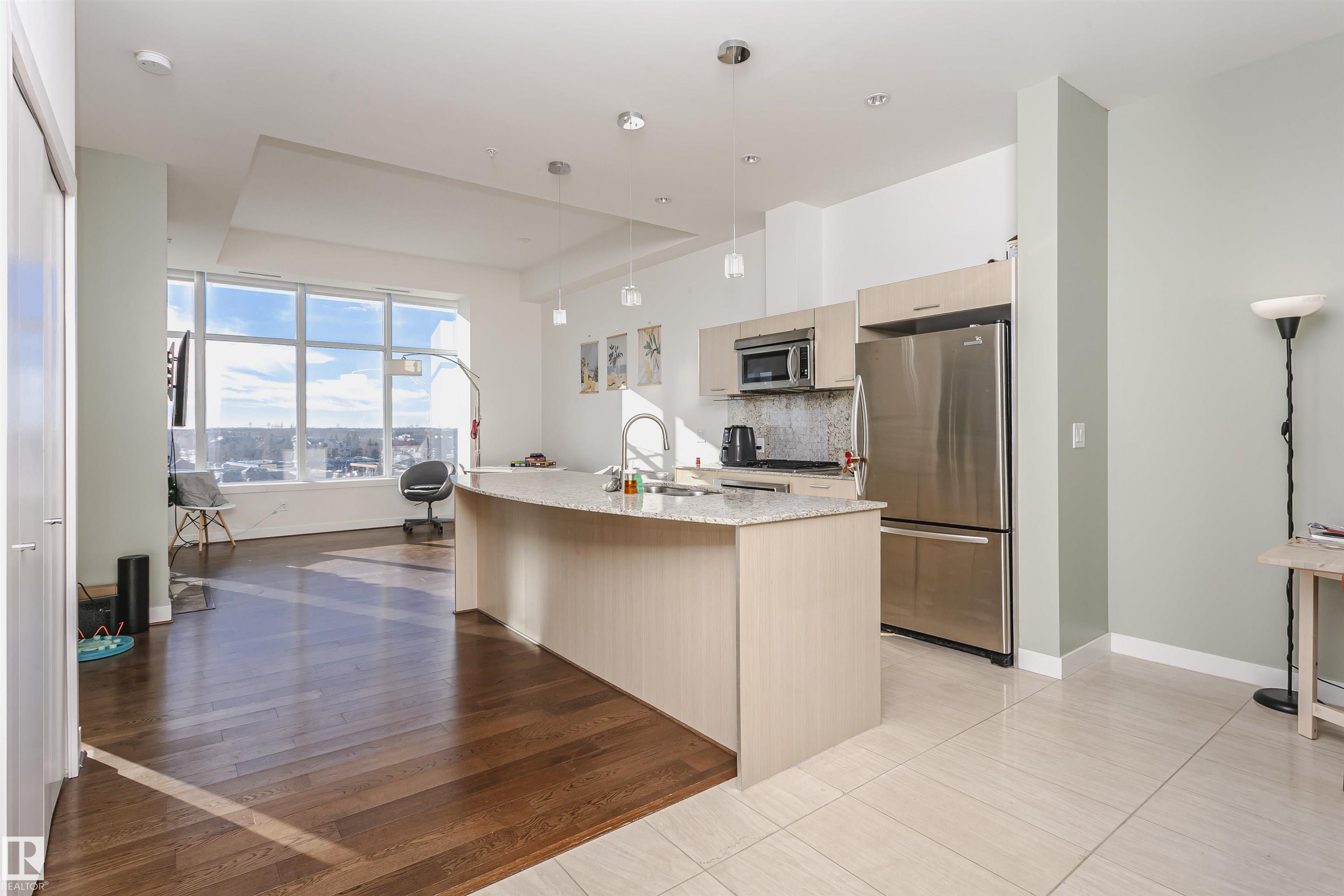 Top-floor, south-facing in sought-after Century Park! Soaring ceilings and expansive windows flood the open-concept layout with natural light, creating a bright and airy atmosphere. Just off the entrance, a versatile flex space offers the perfect spot for a home office, dining area, or reading nook. The modern kitchen showcases granite countertops, a gas stovetop, built-in oven and microwave, plus a large island. The spacious bedroom features dual closets and convenient dual-entry access to the 4-piece ensuite. Relax outdoors on your sunny private balcony with gas BBQ hookup. Complete with titled underground parking, a separate titled storage cage, fitness centre access, and ALL utilities included in the condo fees. Just steps to the LRT, shopping, restaurants, and minutes to major routes. This is urban convenience at its best!
