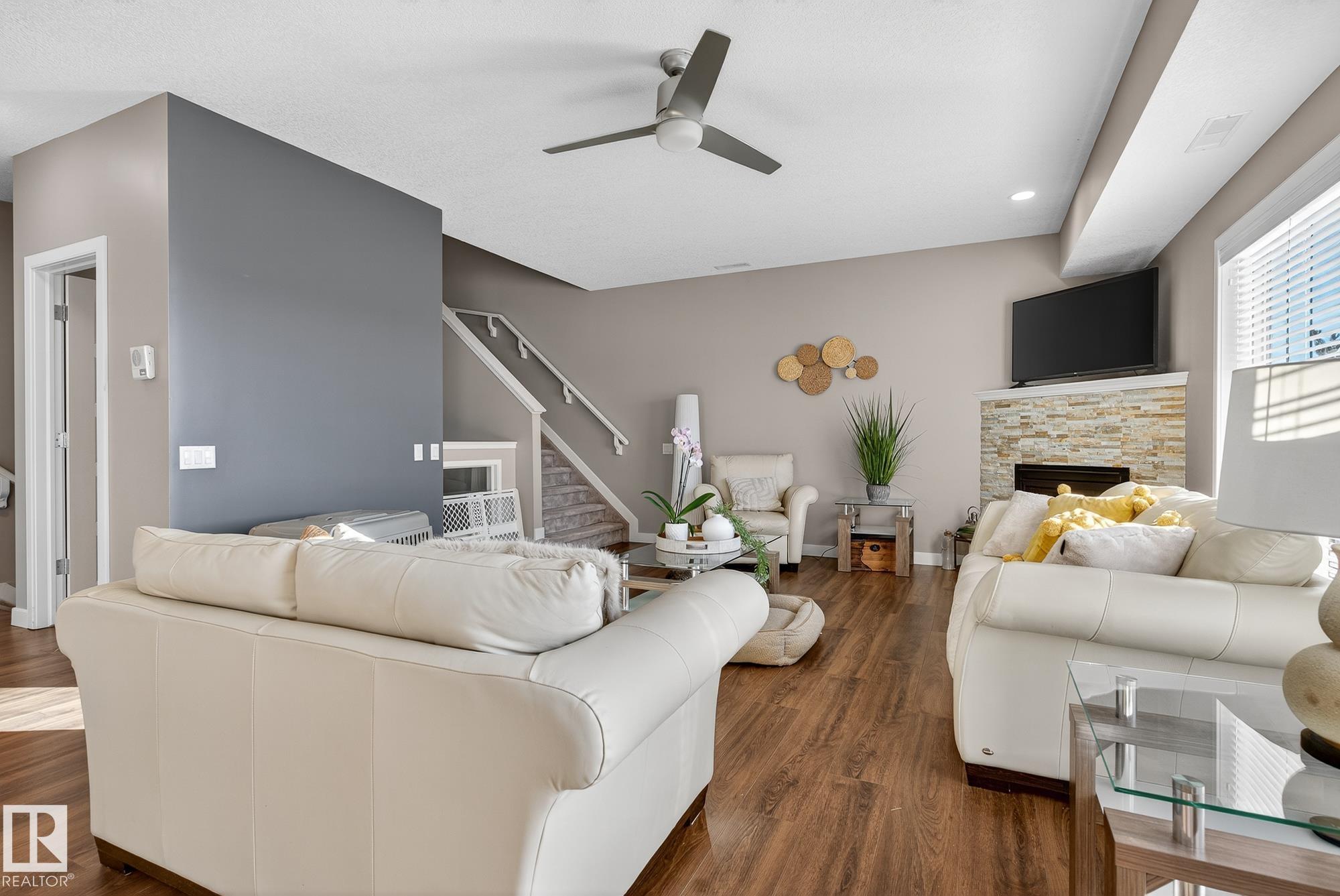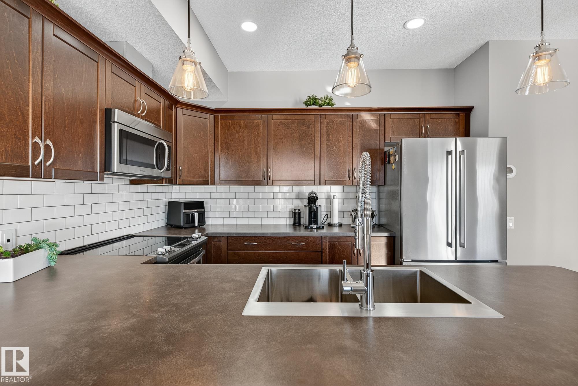 Recently Renovated! This 1739 sqft 2 bed, END UNIT TOWNHOUSE has 4 bathrooms! Located in South Terwillegar includes HEAT & WATER in the condo fee. Open Concept Main Floor boasts a Gourmet kitchen w/high-end appliances, Spacious Peninsula Kitchen, Cherry Wood Cabinets, and an abundance of drawers/cabinets throughout. Patio door access off kitchen to balcony (w/ gas-line). Air Conditioning. Large south facing windows for natural sunlight throughout. The Living Room and main floor has Stone Faced f/p, with newer luxury vinyl plank flooring, dining area & 9 ft ceilings and main floor laundry. Upstairs features large master w/16 ft loft ceiling, walk-in closet & 4-piece ensuite w/ soaker tub. Additional bedroom features a large walk in clodet & 4 piece bath completes the second floor. Recently renovated finished basement. ATTACHED SINGLE GARAGE, additional parking on outside pad - visitor parking steps from unit. Walking to spray park, public transport, shops & amenities. Quick access to Anthony Henday!