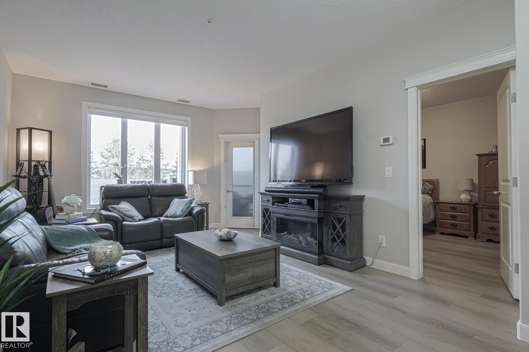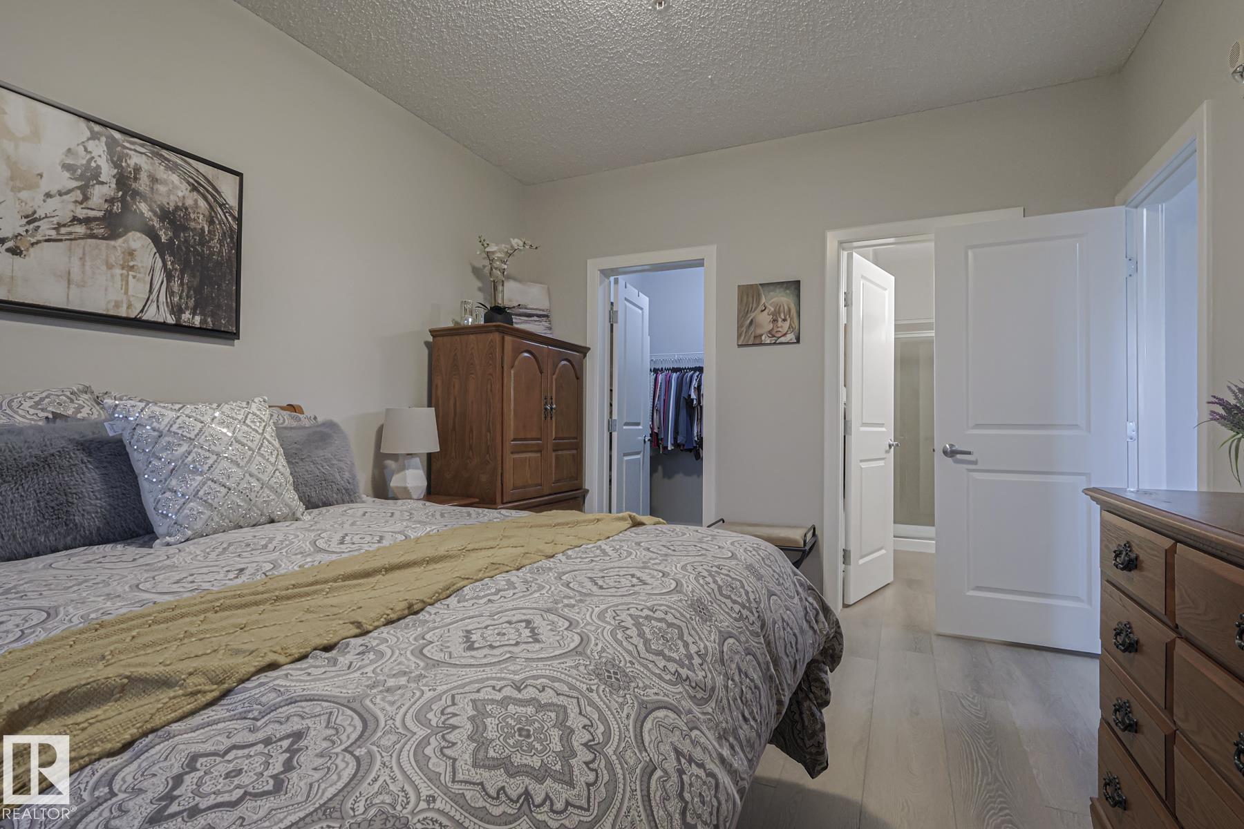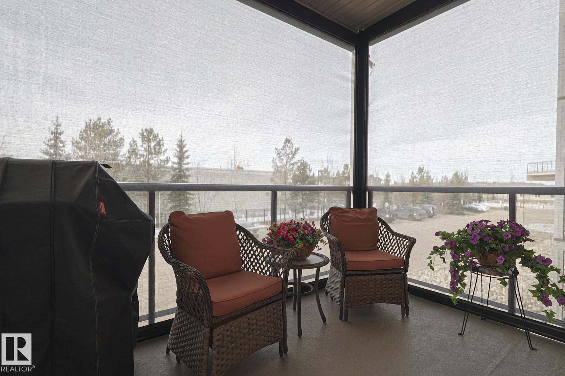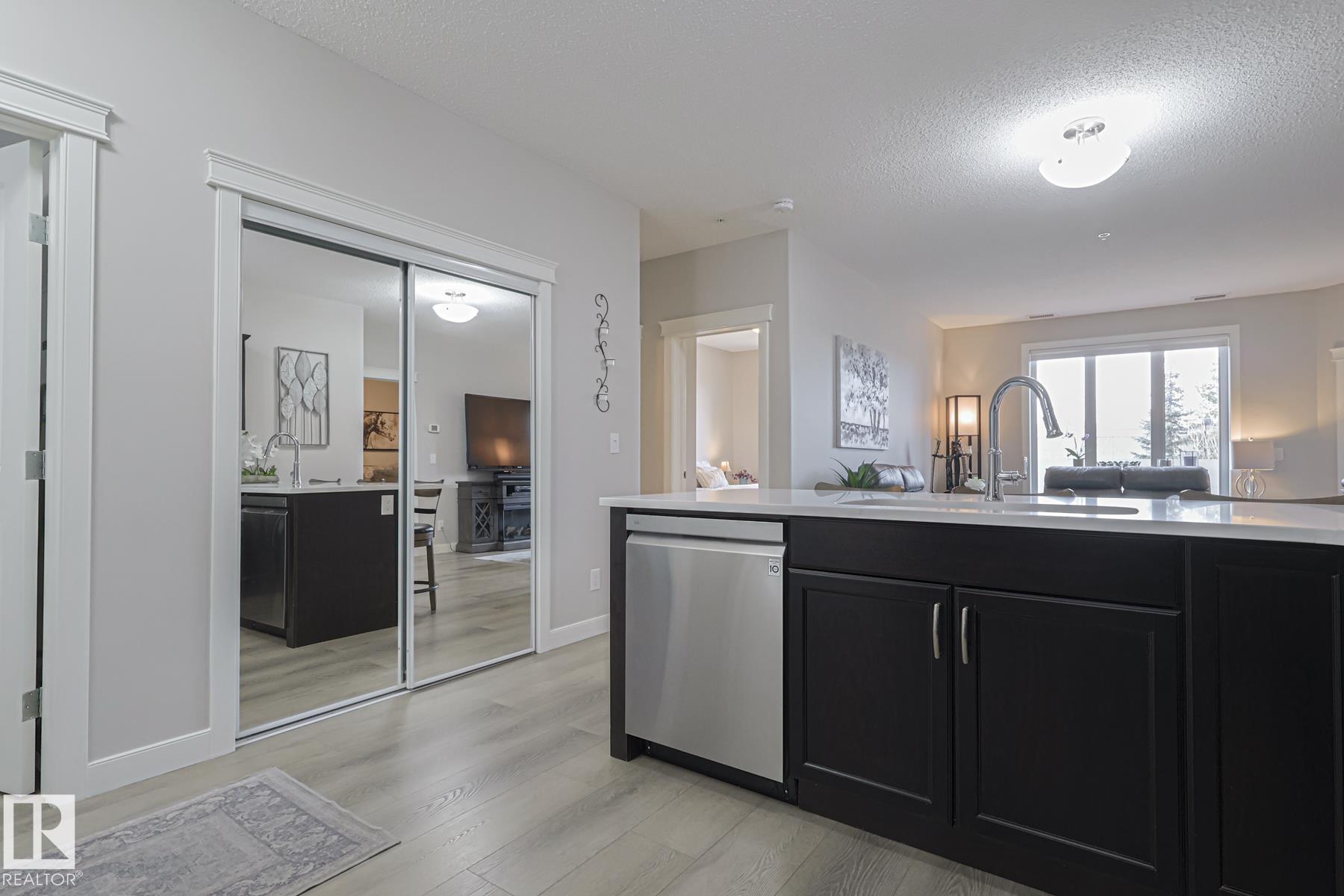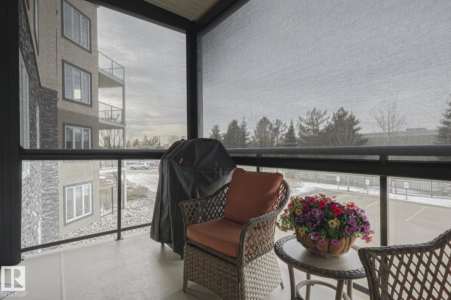 Element Lofts & Flats! Elegance abounds in this renovated & immaculate condominium! Offering a bright & open floorplan with peninsula style kitchen, living room, primary bedroom with ensuite & walk-in closet, & bedroom #2 (conveniently located next to the main bathroom). In-suite laundry & storage; 2 titled parking stalls (1 underground stall w/storage cage, 1 surface stall). Renovations within the last 3 years include: luxury vinyl plank throughout, kitchen with matte walnut cabinets (refinished), quartz counters, backsplash & stainless steel appliances (3 yrs old). Bathroom updates include a glass shower door in the ensuite, quartz vanity tops w/undermount basins, new toilets & upgraded lighting. In-suite laundry offers plenty of space and includes a quartz countertop, front load washing machine (1 year old), and dryer. A HIGHLIGHT! A BRAND NEW RETRACTABLE POWER SCREEN SYSTEM on balcony, offering privacy and sun & wind protection - a $12,000.00 upgrade. The most walkable complex in Sherwood Park!