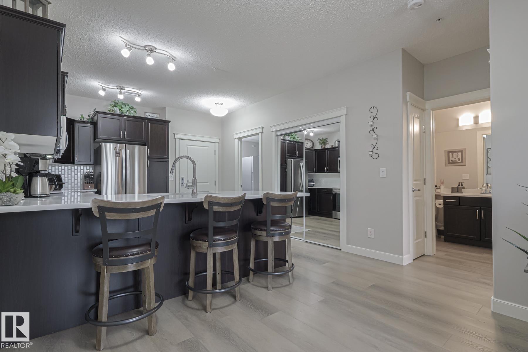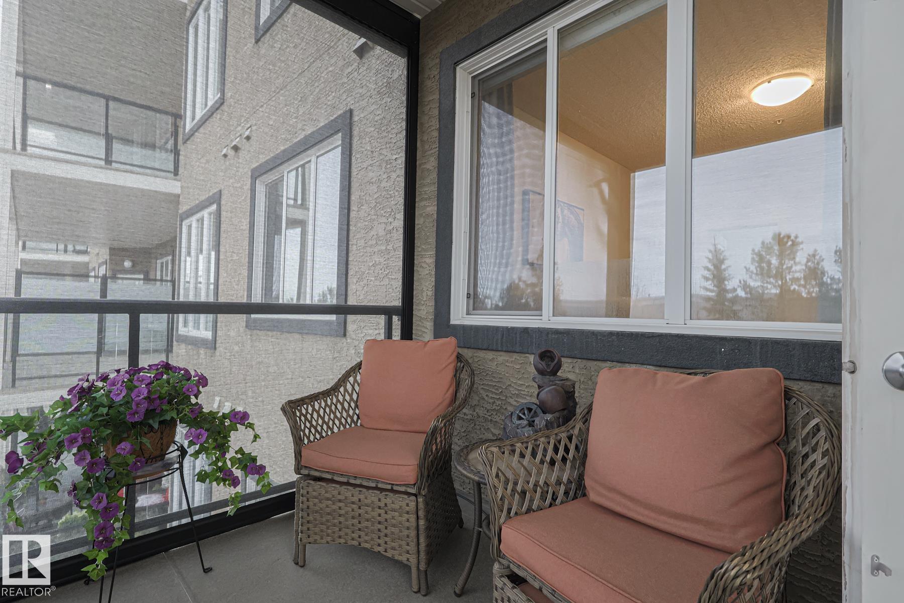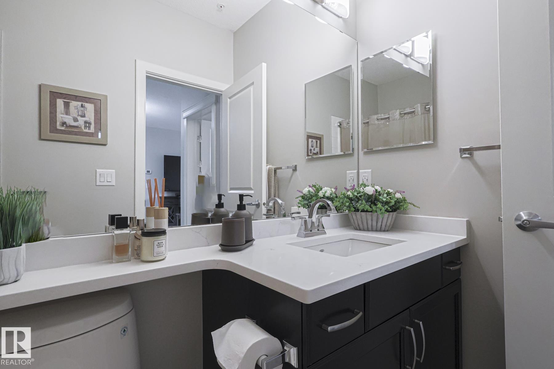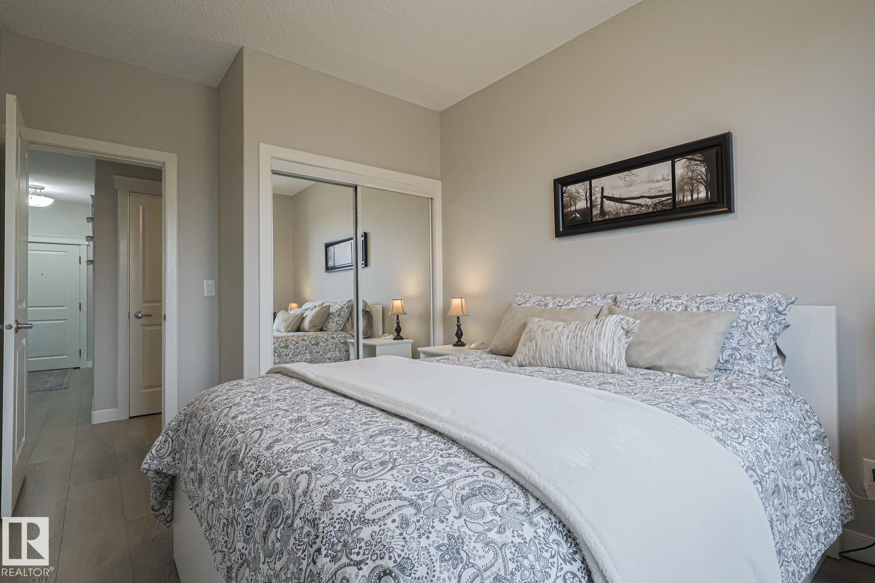 Element Lofts & Flats! Elegance abounds in this renovated & immaculate condominium! Offering a bright & open floorplan with peninsula style kitchen, living room, primary bedroom with ensuite & walk-in closet, & bedroom #2 (conveniently located next to the main bathroom). In-suite laundry & storage; 2 titled parking stalls (1 underground stall w/storage cage, 1 surface stall). Renovations within the last 3 years include: luxury vinyl plank throughout, kitchen with matte walnut cabinets (refinished), quartz counters, backsplash & stainless steel appliances (3 yrs old). Bathroom updates include a glass shower door in the ensuite, quartz vanity tops w/undermount basins, new toilets & upgraded lighting. In-suite laundry offers plenty of space and includes a quartz countertop, front load washing machine (1 year old), and dryer. A HIGHLIGHT! A BRAND NEW RETRACTABLE POWER SCREEN SYSTEM on balcony, offering privacy and sun & wind protection - a $12,000.00 upgrade. The most walkable complex in Sherwood Park!