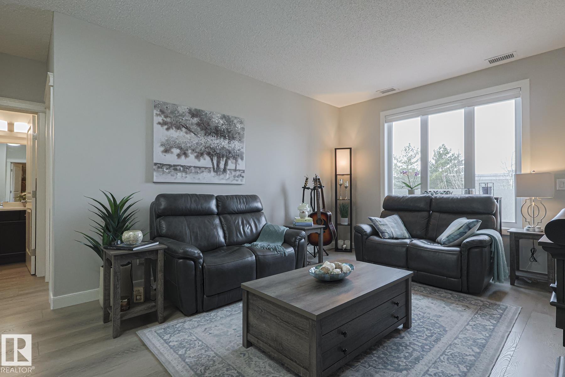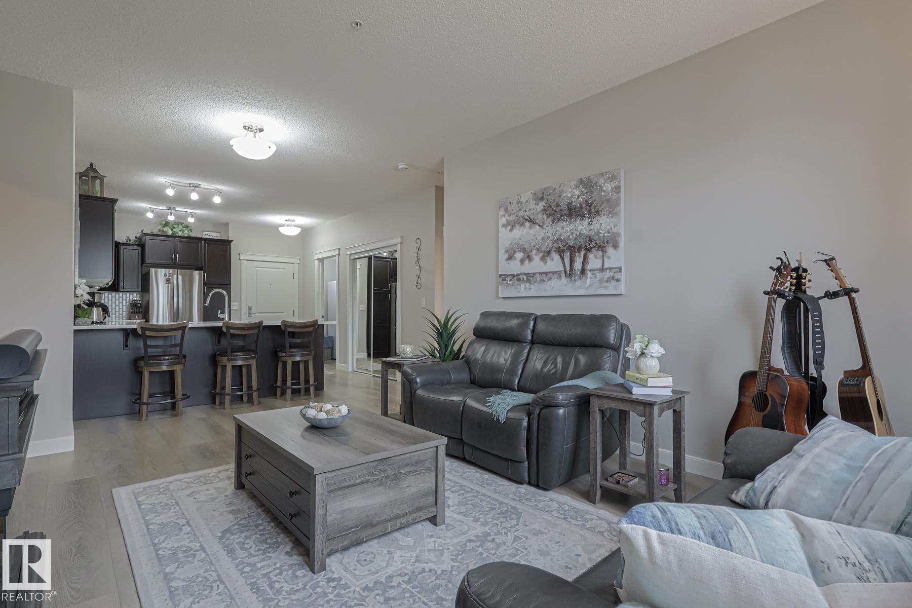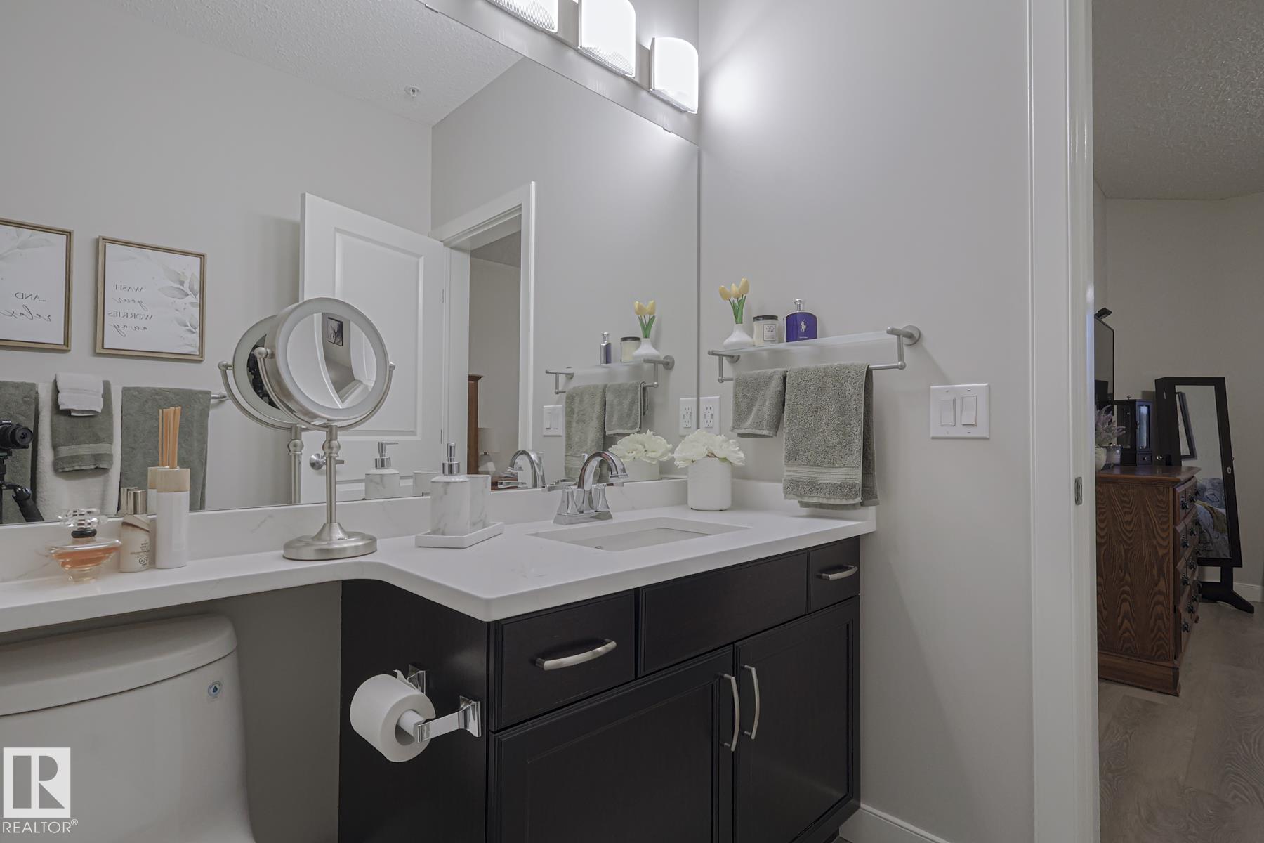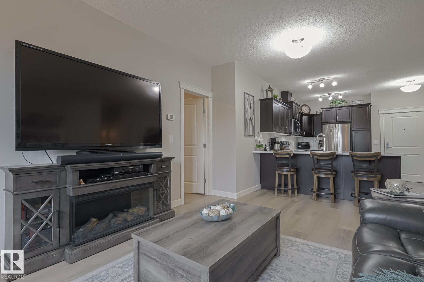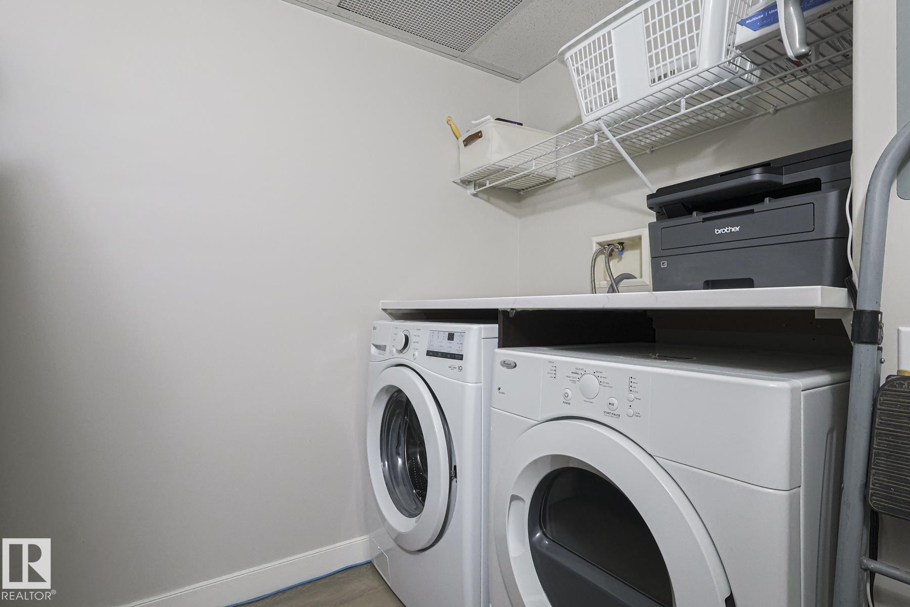 Element Lofts & Flats! Elegance abounds in this renovated & immaculate condominium! Offering a bright & open floorplan with peninsula style kitchen, living room, primary bedroom with ensuite & walk-in closet, & bedroom #2 (conveniently located next to the main bathroom). In-suite laundry & storage; 2 titled parking stalls (1 underground stall w/storage cage, 1 surface stall). Renovations within the last 3 years include: luxury vinyl plank throughout, kitchen with matte walnut cabinets (refinished), quartz counters, backsplash & stainless steel appliances (3 yrs old). Bathroom updates include a glass shower door in the ensuite, quartz vanity tops w/undermount basins, new toilets & upgraded lighting. In-suite laundry offers plenty of space and includes a quartz countertop, front load washing machine (1 year old), and dryer. A HIGHLIGHT! A BRAND NEW RETRACTABLE POWER SCREEN SYSTEM on balcony, offering privacy and sun & wind protection - a $12,000.00 upgrade. The most walkable complex in Sherwood Park!
