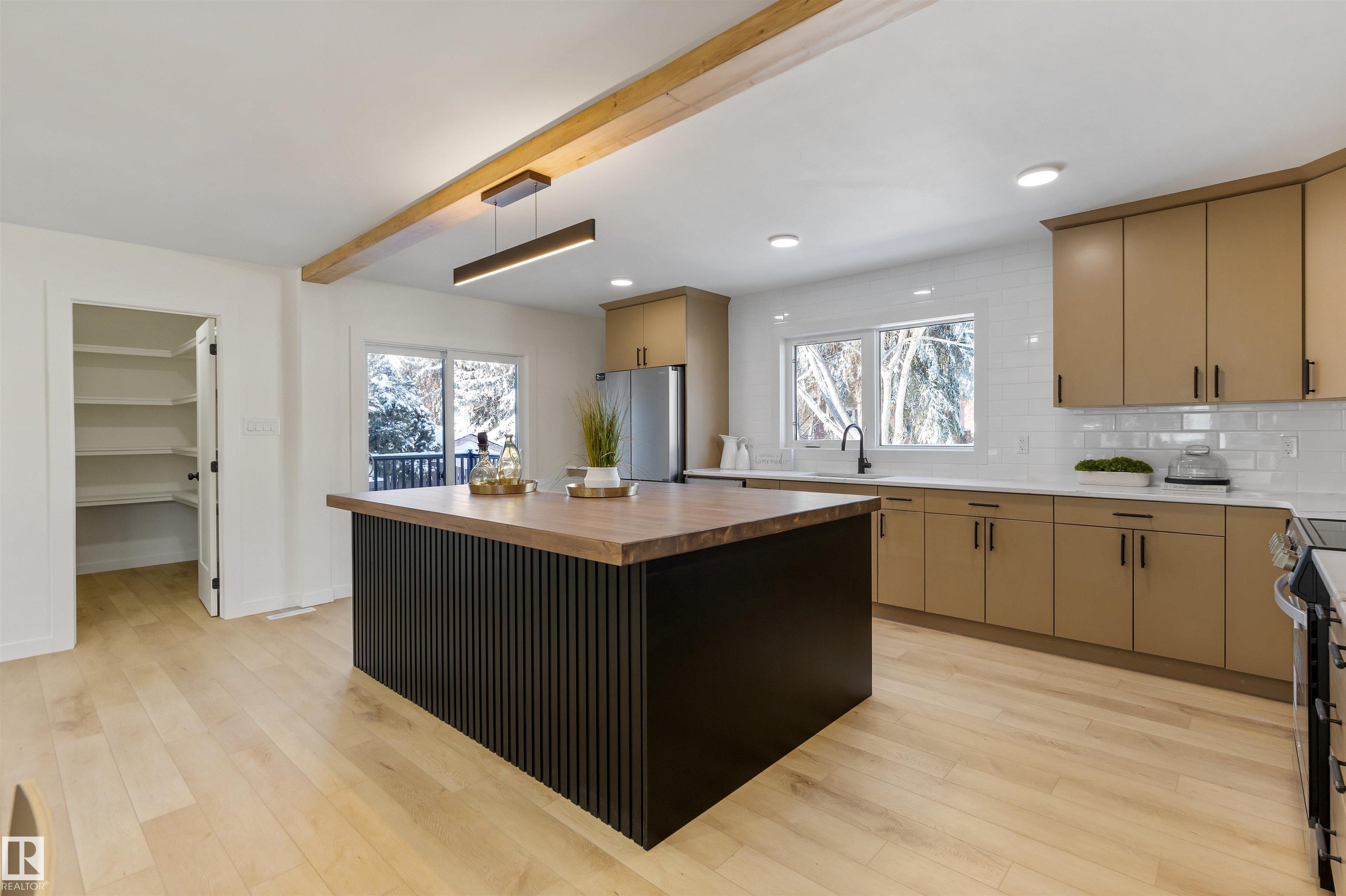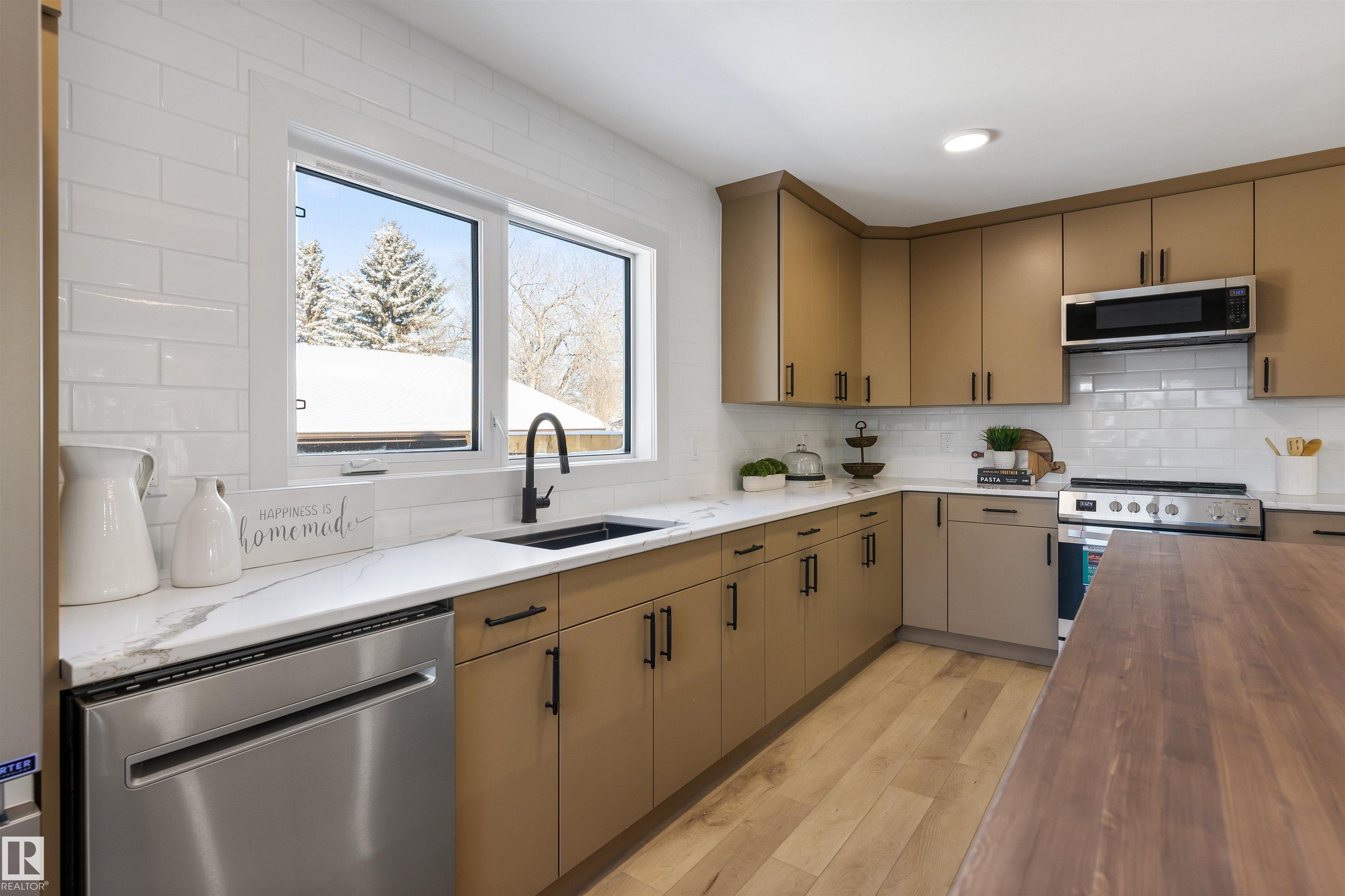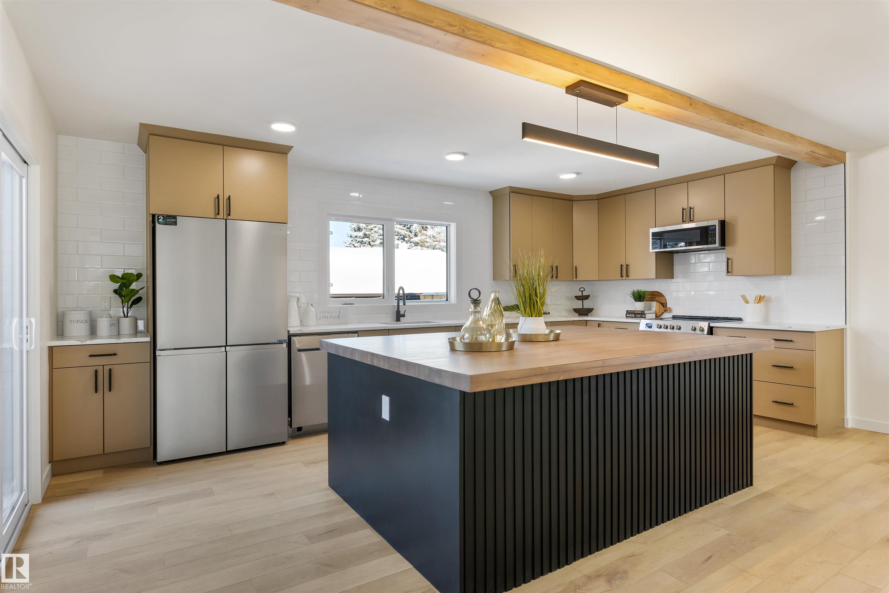 Completely RENOVATED from top to bottom, this beautifully updated bilevel offers over 1400 sqft of thoughtfully designed living space plus a FULLY FINISHED basement. The heart of the home is the custom kitchen featuring quartz countertops, a walk-in pantry, built-in coffee station and an extra large island with a hand carved wooden countertop, all flowing seamlessly into the open concept dining and living area with a gorgeous fireplace and an abundance of natural light through oversized windows. The main floor includes two bedrooms and two full baths, highlighted by a luxurious primary suite with a spa-inspired ensuite and walk-in closet. Downstairs you?ll find a spacious rec room with bar area, two additional bedrooms, full bath and laundry. New vinyl plank flooring, upgraded electrical, new deck and an oversized double detached garage complete this move-in ready home?just unpack and enjoy.