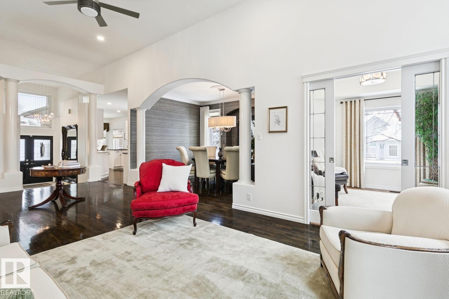 LOW MAINTENANCE | EXECUTIVE GATED COMMUNITY Located in Oleskiw just steps from the river valley, this home features over 3,500 sq.ft of finished living space. Featuring 5 bedrooms & 3.5 baths, the layout is ideal for those looking to right-size without compromising on space or functionality - perfect for hosting. You'll be impressed by the main floor's vaulted ceilings & hardwood floors that run throughout the formal living & dining areas. The gourmet kitchen features high-end appliances, quartz countertops & a breakfast nook. 2 bedrooms share a 5PC Jack&Jill bath, plus main floor laundry & powder room. Upstairs, the private primary suite includes a walk-in closet, electric fireplace, motorized blackout blinds & spa-inspired ensuite with jetted soaker tub. The fully finished basement offers a large rec room, wet bar, 2 bedrooms, 4PC bath & 2 flex rooms. Heated oversized garage w epoxy flooring, A/C & low-maintenance landscaping complete this move-in-ready home.