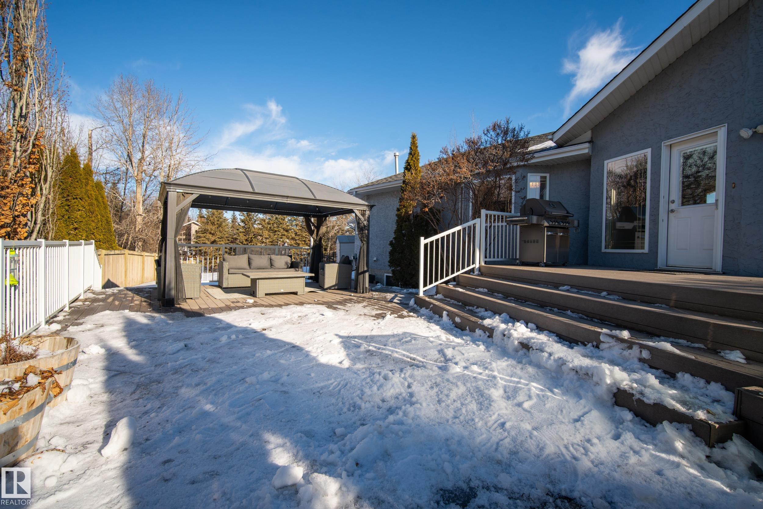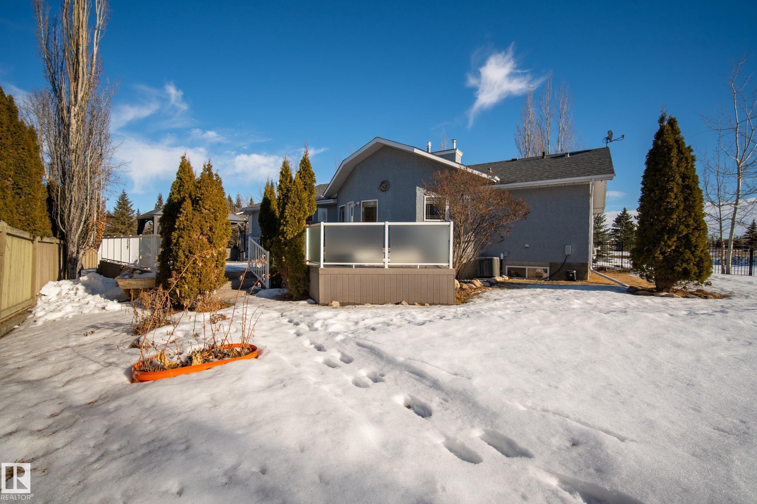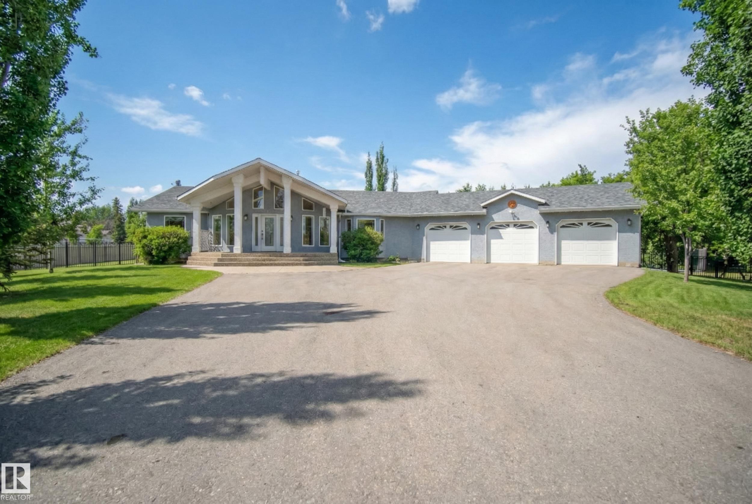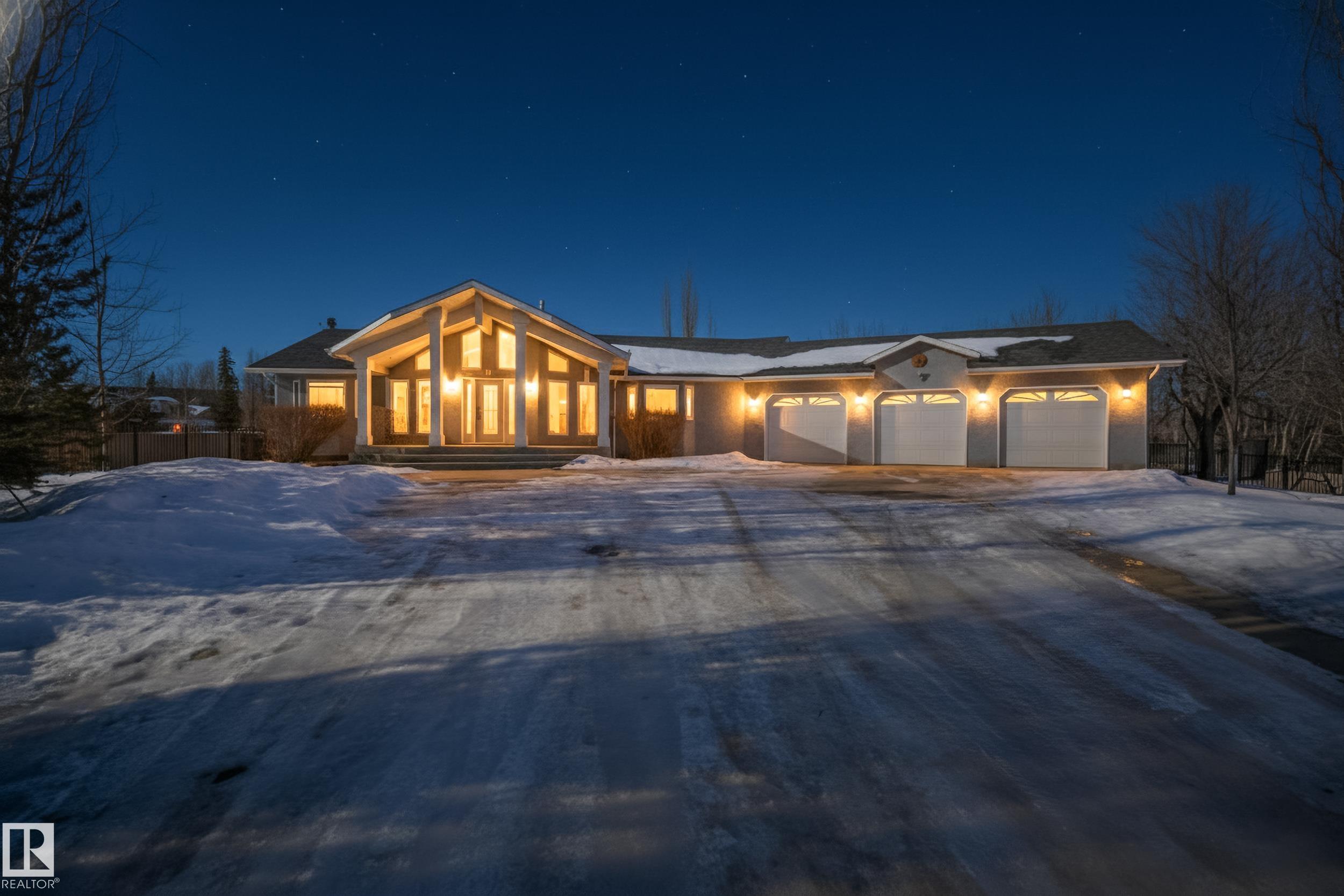 Welcome to this gorgeous custom build BUNGALOW on .58 of an acre! Located minutes from the city,with Municipal Services,you can enjoy the peace and privacy of the country while staying closely connected to amenities. Offering over 2150 sq ft on the main floor with a fully developed basement, heated TRIPLE garage this home has it all! The main floors vaulted ceilings, open floor plan and dual sided fireplace impress upon entry.The chef inspired kitchen with granite counter tops,a raised eating bar, and a spacious dining area-perfect for entertaining. Step outside to your private backyard oasis including a fully fenced yard, multi level composite deck and hot tub! The main floor offers primary bedroom with an updated luxurious 5Pc bath, 2 additional bedrooms, 4Pc bath, 2 Pc bath, & laundry room. The lower level includes 1 bedroom,3 Pc bath,1 generous flex room, & large entertainment room. RV parking just out the door, this property is a must see! *Some photos/parts of video digitally enhanced/staged.