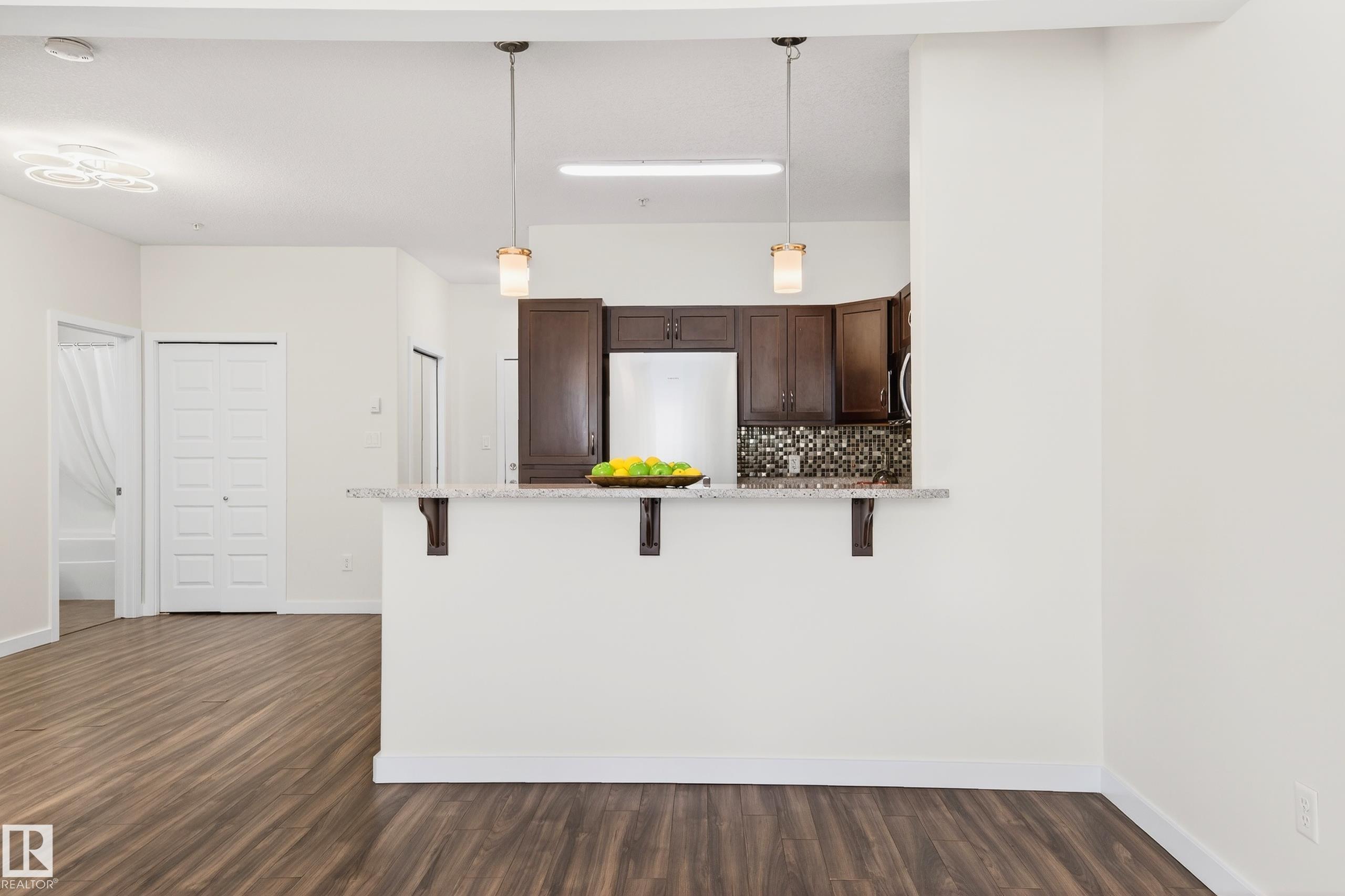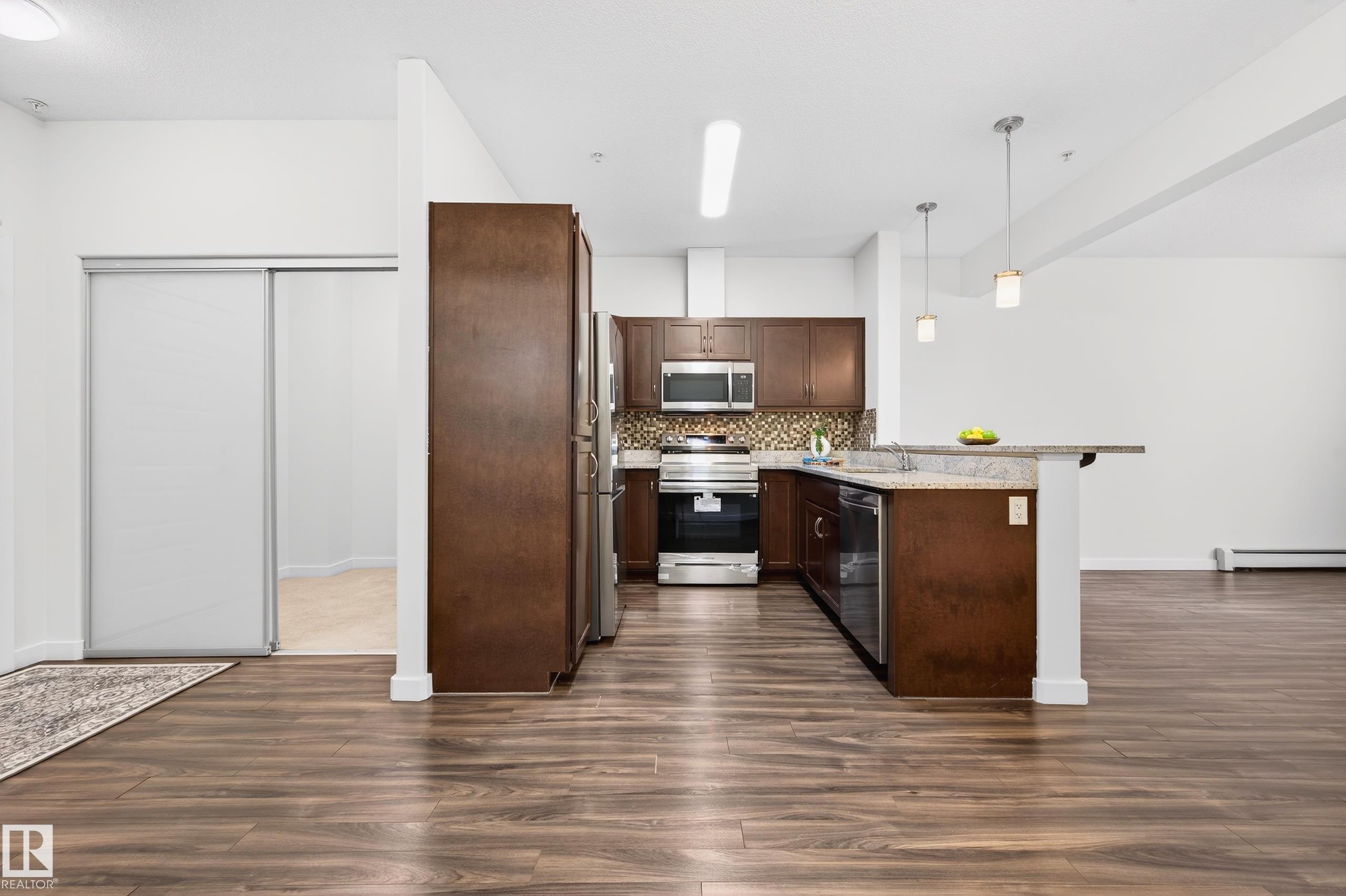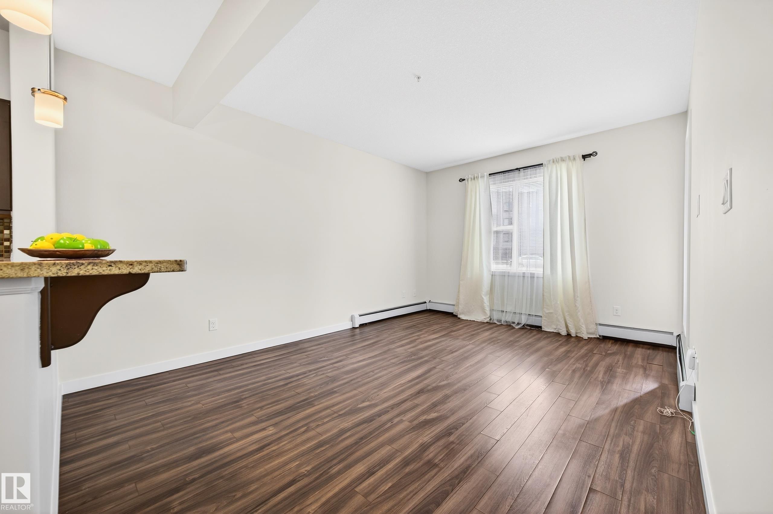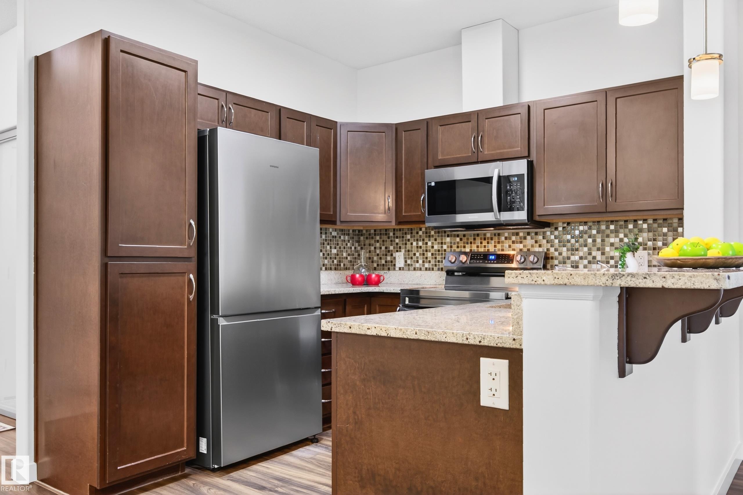 Immaculate main-floor unit offering 1BD+ Den, in-suite laundry, and a titled underground parking stall with storage cage. Located in a beautifully designed, pet-friendly complex, this home delivers the perfect blend of comfort, style, and convenience. The open-concept layout includes a bright living room and a stylish kitchen equipped with Brand-New SS appliances, granite countertops, and an eating bar?perfect for casual dining. Versatile den/office ideal for working from home. With new lighting, fresh paint, 9' ceilings, and laminate flooring, the space feels modern and thoughtfully updated. The spacious primary bedroom easily accommodates a king-sized bed and includes a walk-in closet. A well-appointed 4-piece bathroom completes the interior. Enjoy the southeast-facing patio. The building offers fantastic amenities, including a fitness centre, social room, and guest suite. Located in the heart of Ambleside. Some photos are virtually staged.
