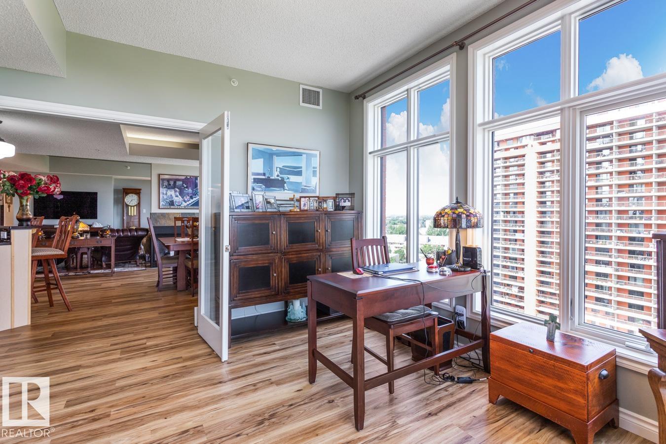 Exceptional Value in this Stunning 1538 sq/ft Two Bed + Den, Two Bath, Two Titled Underground Stalls, Air conditioned Hi Rise Condominium with River Valley & City Views. This bright & spacious home features an open floor plan with floor to ceiling triple pane windows in the main living area with a three sided fireplace offering some separation. The cooks kitchen has a pantry, island with breakfast bar, granite counter tops, glass tile backsplash & top of the line stainless steel appliances. The primary bedroom has a walk in closet & updated four piece bath, the 2nd bedroom is located just off the updated 3 piece bath. The view-t-full Den is going to be the sought after work space. The east/south balcony has a gas line for the bar-b-q. The home features numerous updates including luxury vinyl plank flooring, updated baths, granite counter tops, appliances, Fan Coil Unit & more! Building amenities include gym, building manager & social room. Pets x one are allowed 10 kg max weight with board approval.