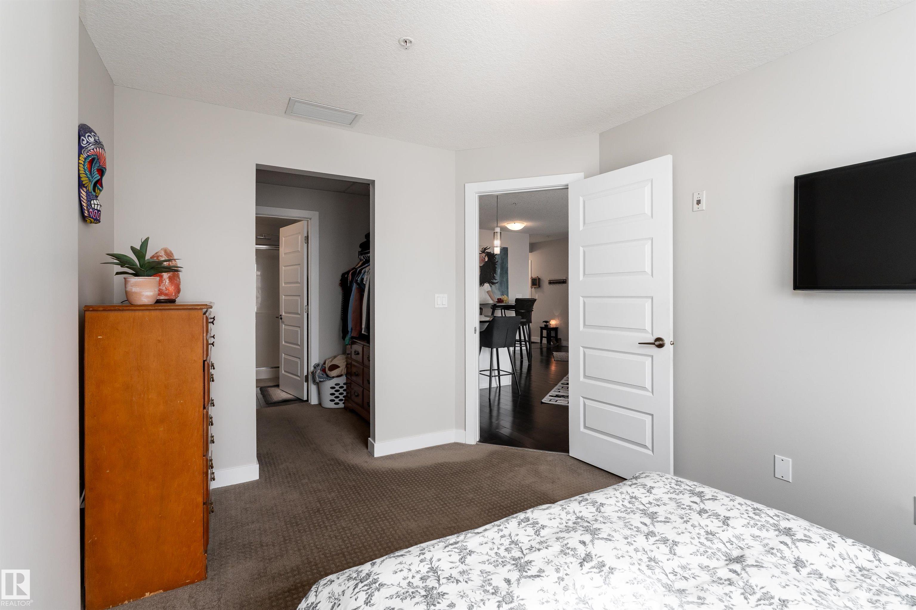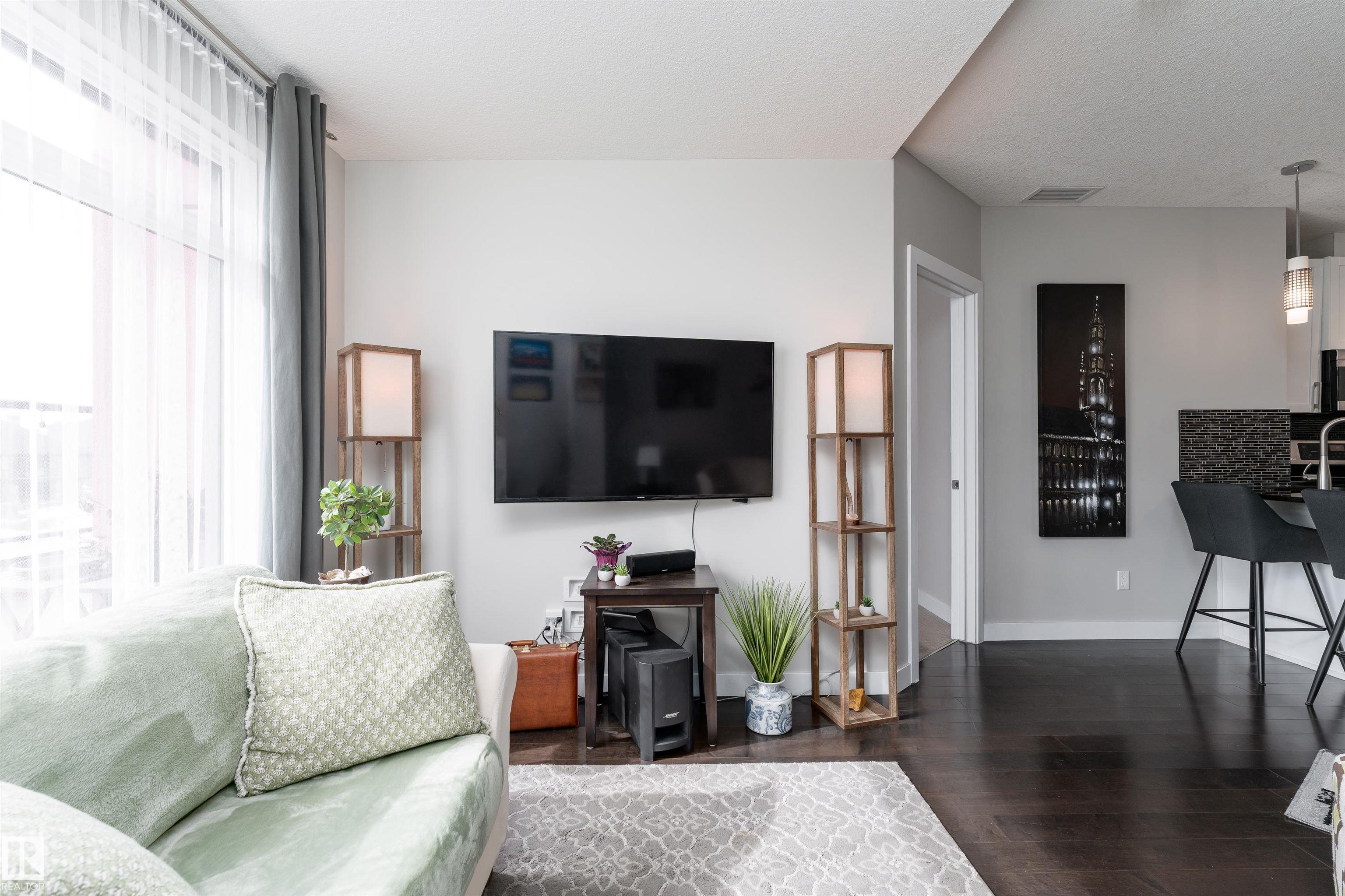 This stunning home has it all-Breathtaking views, a massive south facing private balcony, and a bright, open layout perfect for entertaining, and underground parking. Hardwood floors flow into a modern kitchen with white cabinetry, granite counters, stainless steel appliances, and an eat-up bar. The living room, filled with natural light, opens to a huge balcony overlooking a serene pond, green space, and walking trails. The primary suite offers scenic views, a walk-through closet, and a stylish 3 pc ensuite, while a second bedroom, 4 pc bathroom, and in-suite laundry complete the unit. Additional features include underground titled parking, central A/C, and building amenities like a gym, social room, and concierge. Enjoy the quiet comfort of a solid concrete building that is ideally located near Anthony Henday and within walking distance to restaurants, shopping, and parks, this home truly combines luxury, convenience, and lifestyle in one exceptional package ready to move in and enjoy.
