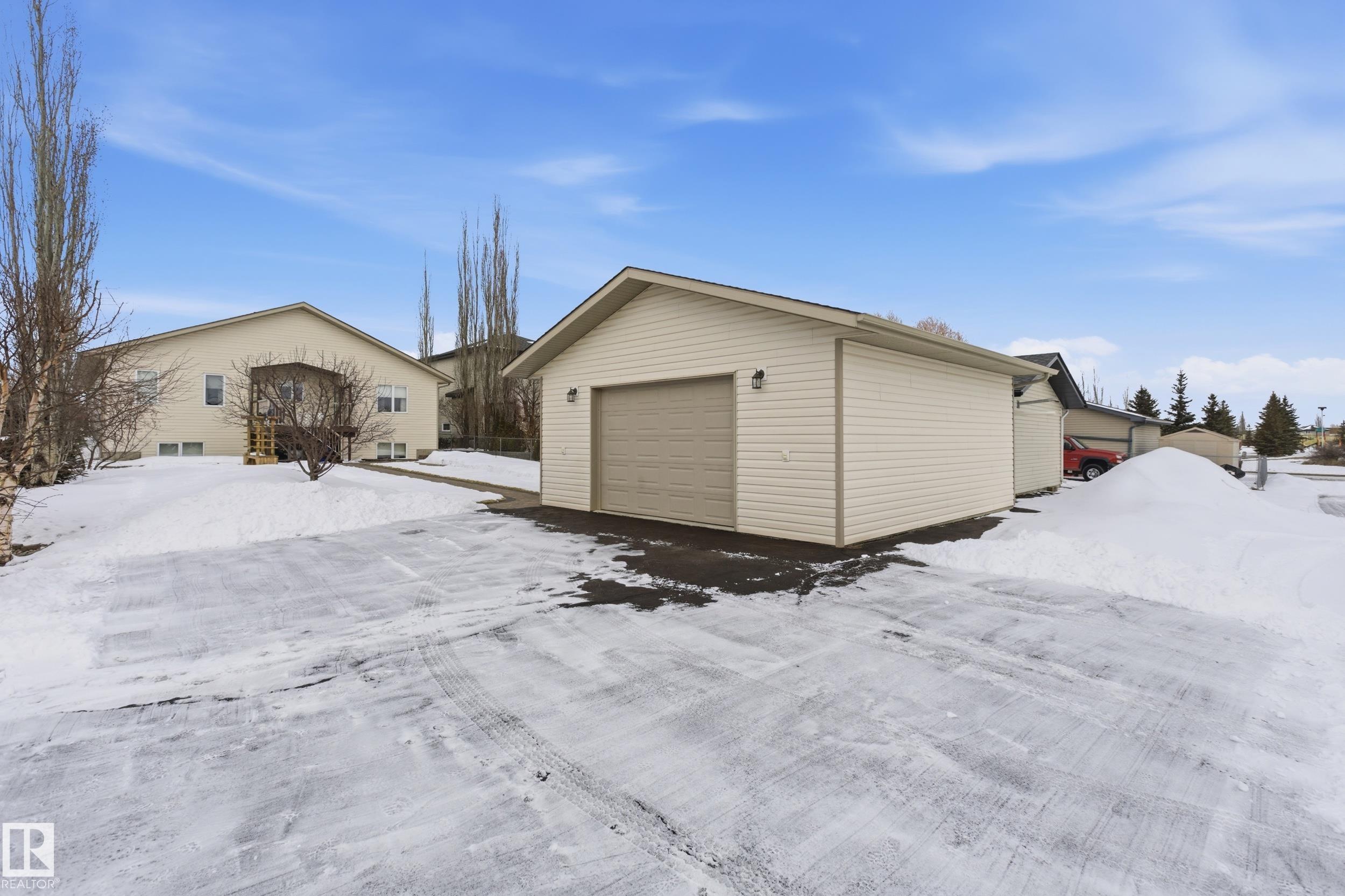 This 1/3 acre in town has it all. Large oversized attached garage with in floor heat ,220 power and a floor drain allows for easy access to the house. The second Garage with Radiant Heat , 220 power allows for toys and additional vehicles. Room for the Trailer and still a firepit and space to enjoy in the backyard. The 2 bedrooms and a den, open kitchen, eating area and living space upstairs with hardwood and Ceramic tile. Downstairs you have 2 more bedrooms and a large living room area as well as a large Laundry room, 4 pc bathroom and lots of storage space. All complete with Air Conditioning and pride of ownership. Just move-in.