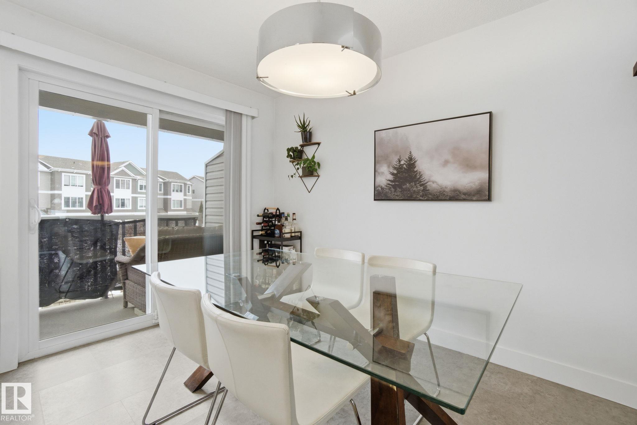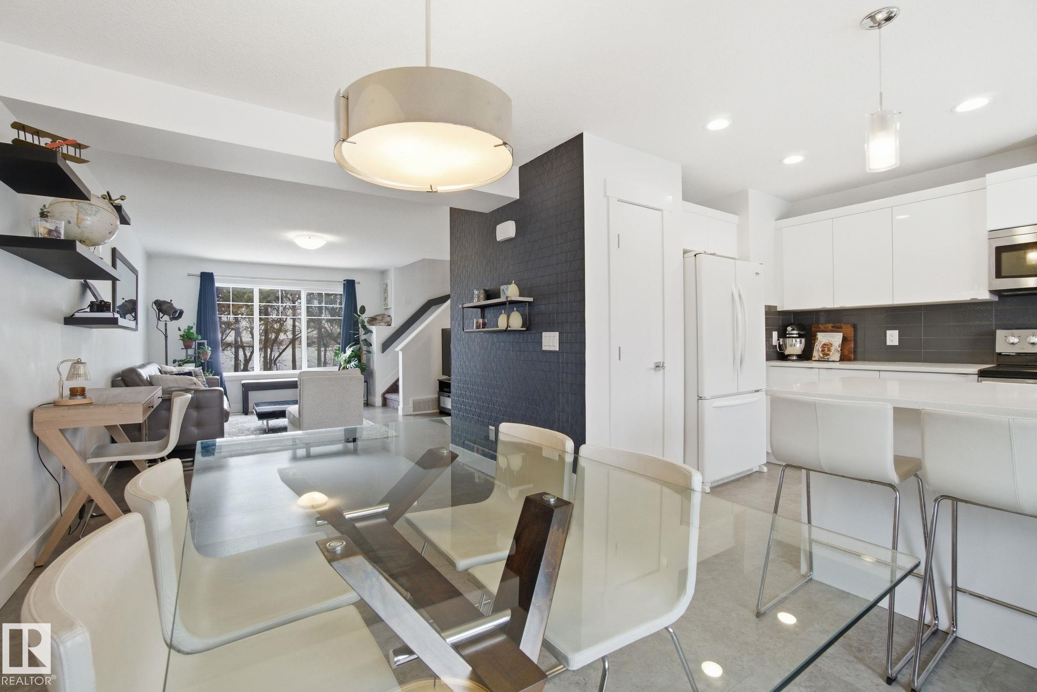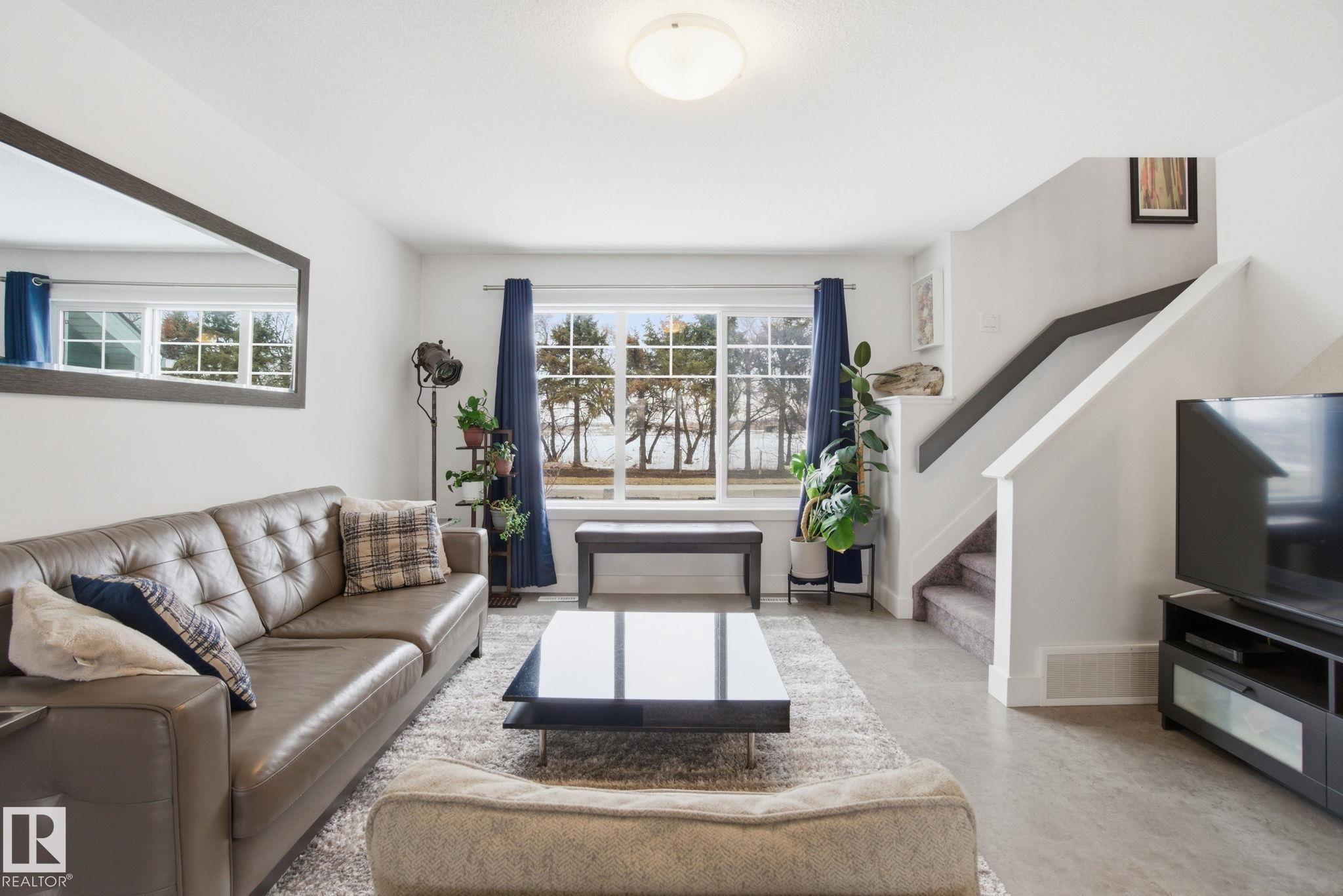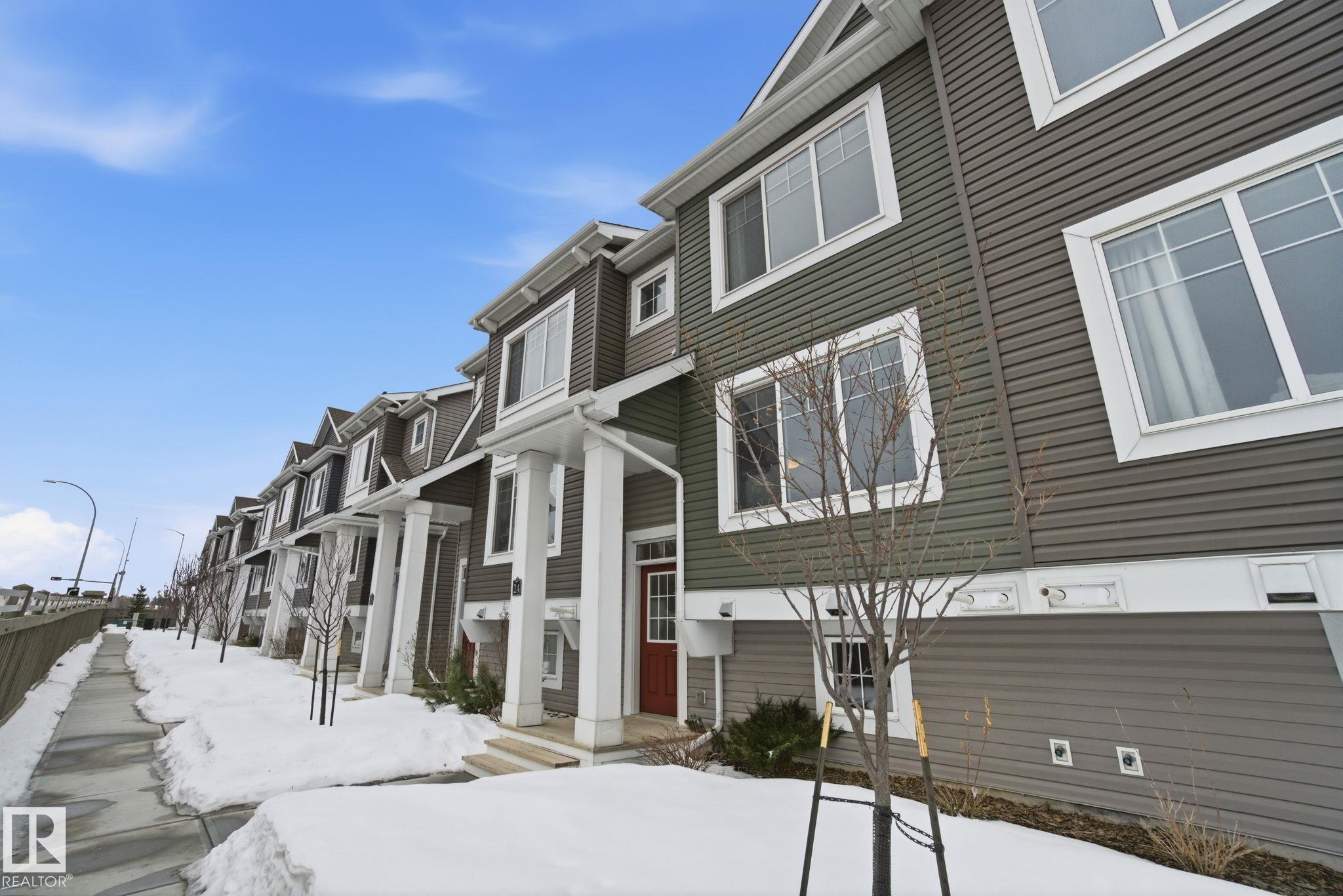 Stunning & impeccably maintained townhome perfectly positioned facing a beautiful stand of mature trees and just steps to Lois Hole Provincial Park, Big Lake, and The Enjoy Centre. The bright main floor showcases wide-plank laminate flooring, a convenient 2-piece bath with ceramic tile & a private balcony complete with gas BBQ hookup. The modern kitchen features sleek quartz countertops, stylish cabinetry and flows seamlessly into the open-concept living and dining area. Upstairs offers two spacious primary bedrooms, each with walk-in closets and their own full ensuite bathrooms. The lower level includes a welcoming entry from the double attached garage along with a dedicated laundry area with stacked washer and dryer. Additional highlights include triple pane windows and unbeatable access to scenic trails, wetlands, and Glendale Golf Club. Ideally located with quick access to St. Albert, Edmonton, and the Anthony Henday, this home offers the perfect blend of comfort, style and convenience!