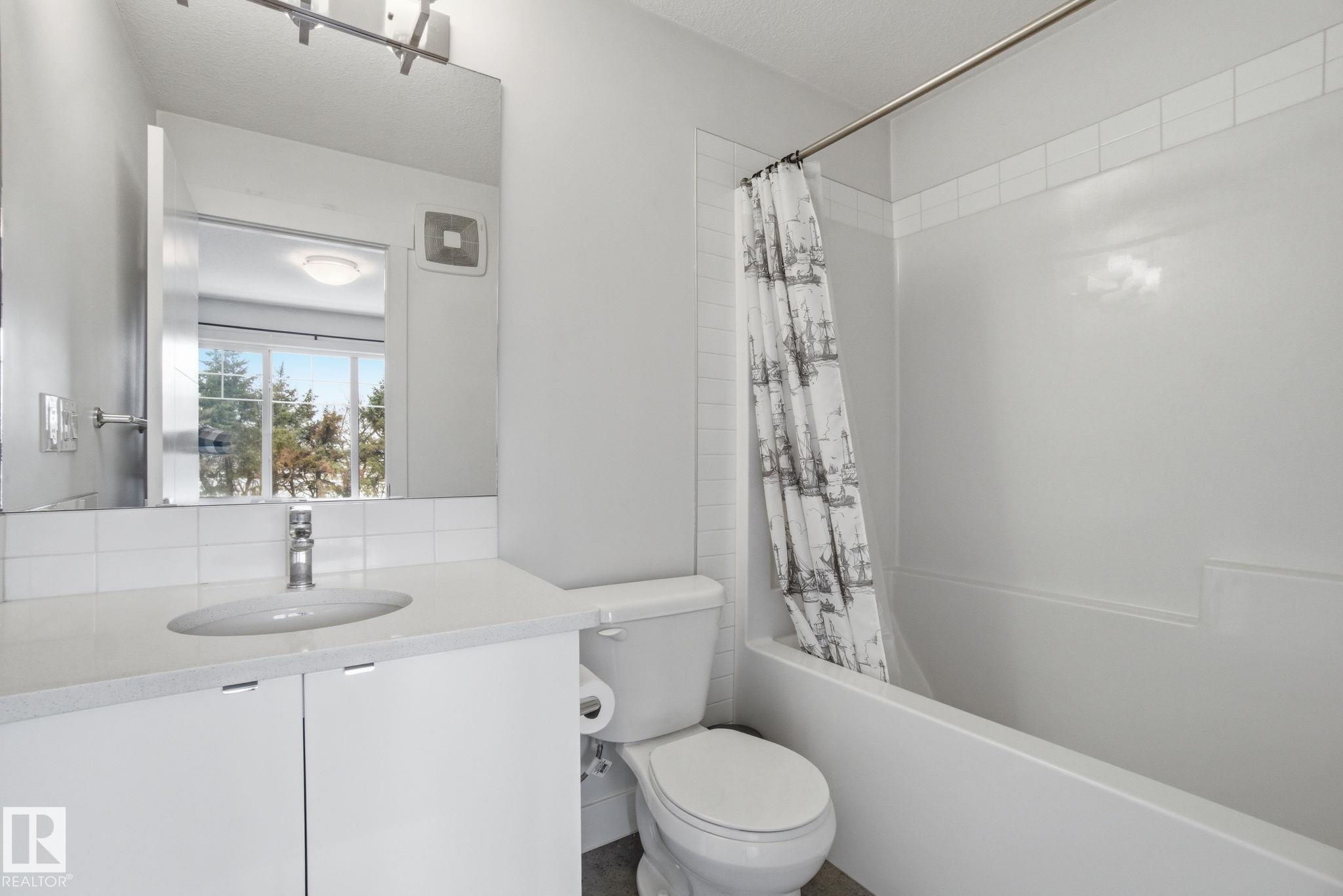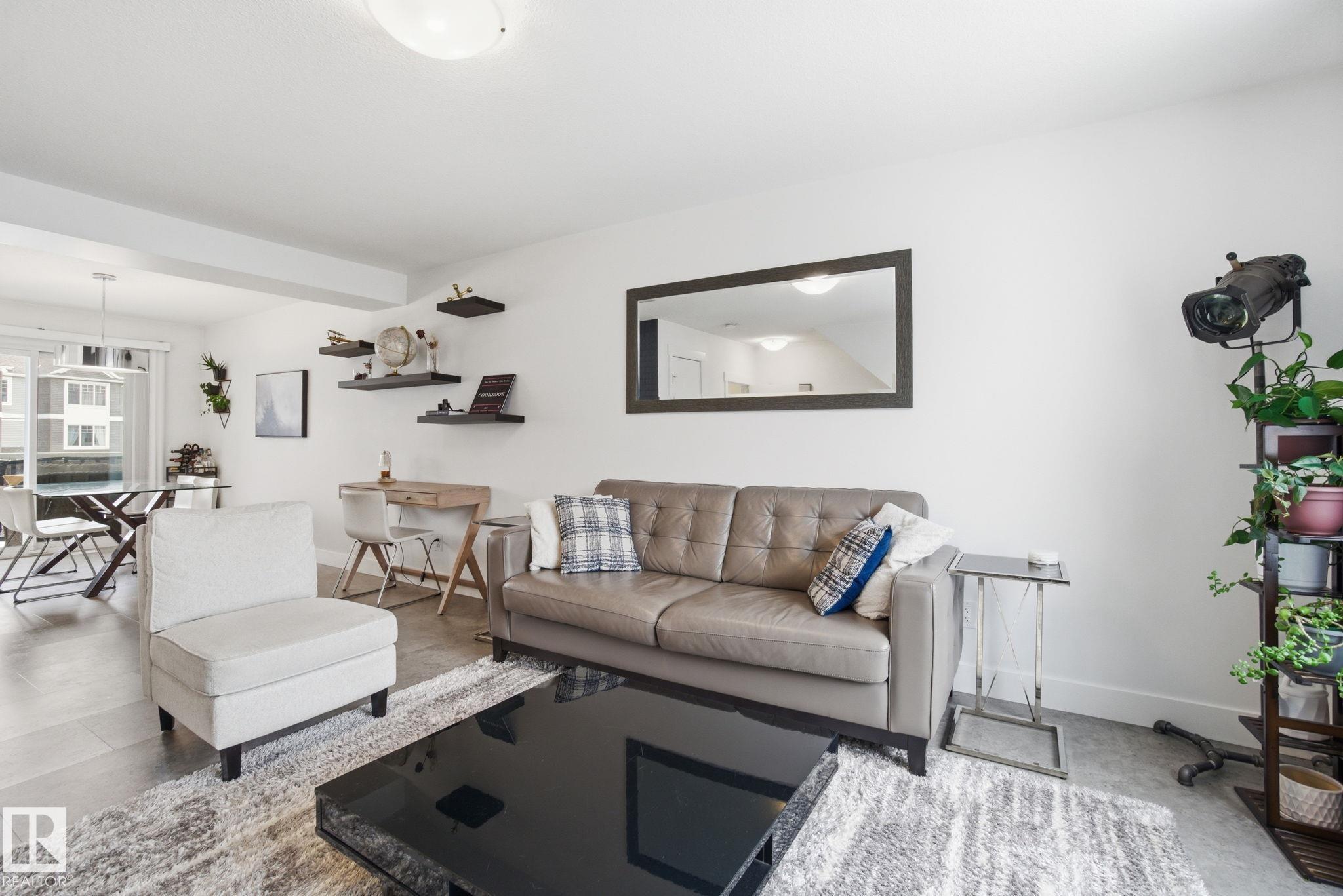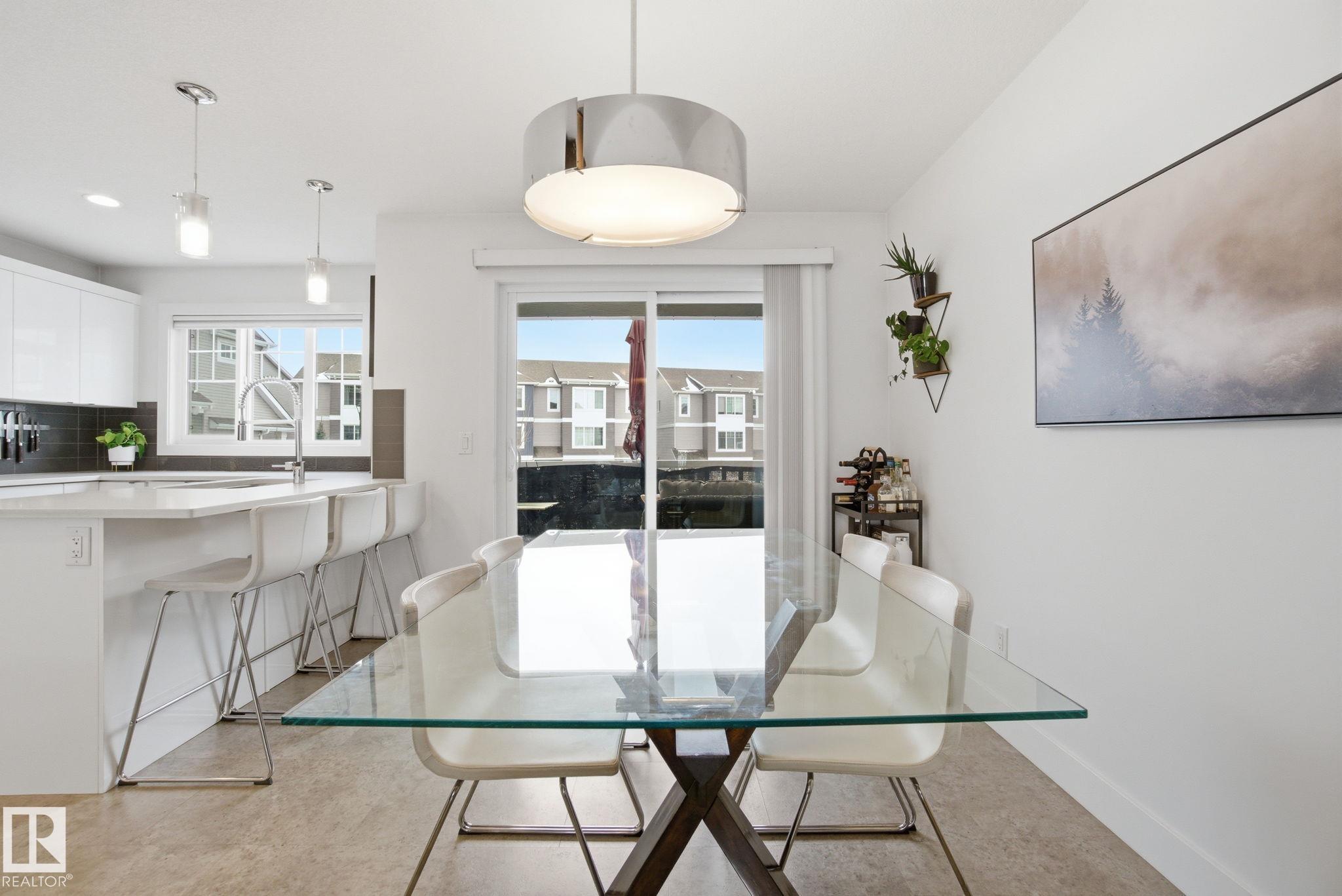 Stunning & impeccably maintained townhome perfectly positioned facing a beautiful stand of mature trees and just steps to Lois Hole Provincial Park, Big Lake, and The Enjoy Centre. The bright main floor showcases wide-plank laminate flooring, a convenient 2-piece bath with ceramic tile & a private balcony complete with gas BBQ hookup. The modern kitchen features sleek quartz countertops, stylish cabinetry and flows seamlessly into the open-concept living and dining area. Upstairs offers two spacious primary bedrooms, each with walk-in closets and their own full ensuite bathrooms. The lower level includes a welcoming entry from the double attached garage along with a dedicated laundry area with stacked washer and dryer. Additional highlights include triple pane windows and unbeatable access to scenic trails, wetlands, and Glendale Golf Club. Ideally located with quick access to St. Albert, Edmonton, and the Anthony Henday, this home offers the perfect blend of comfort, style and convenience!