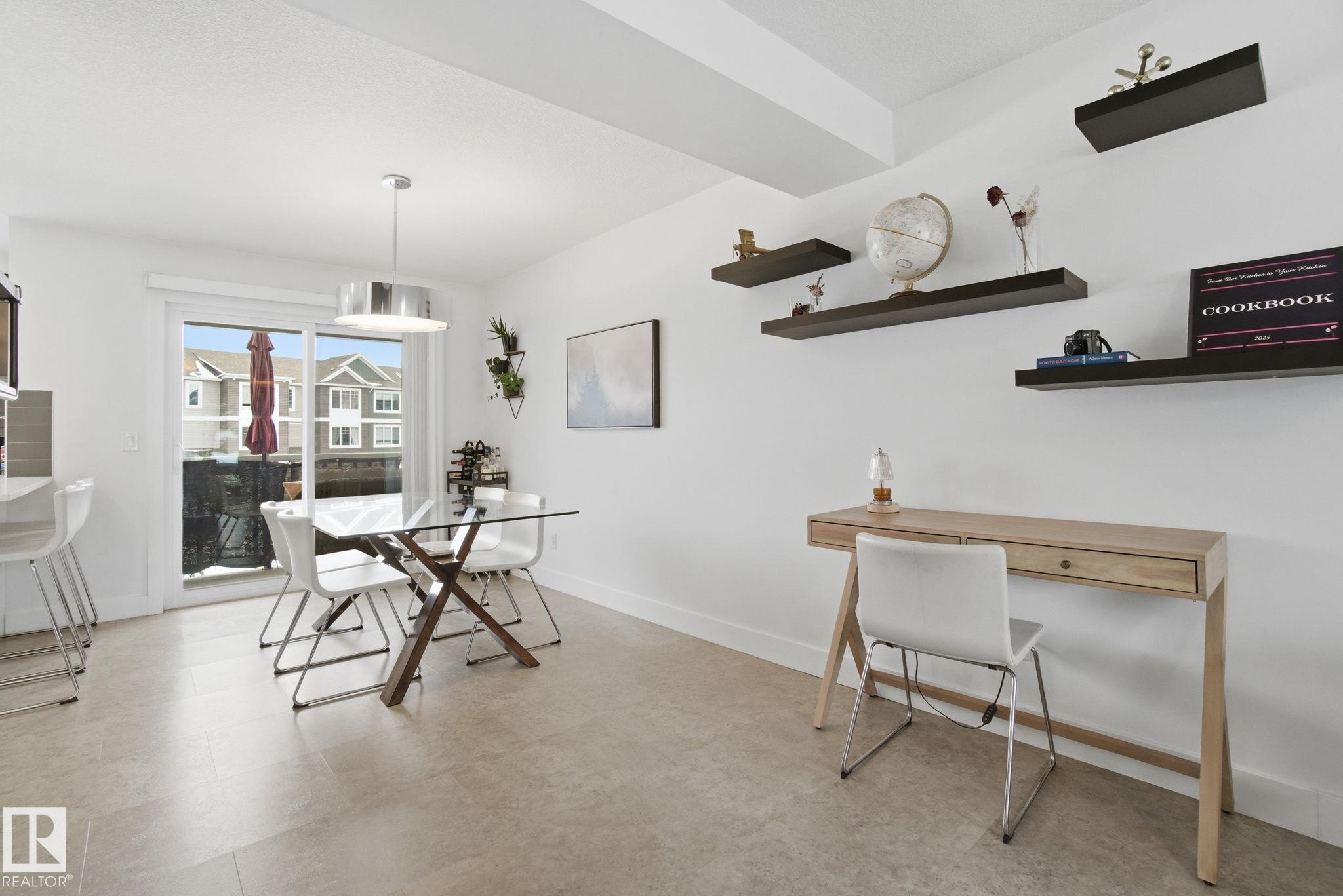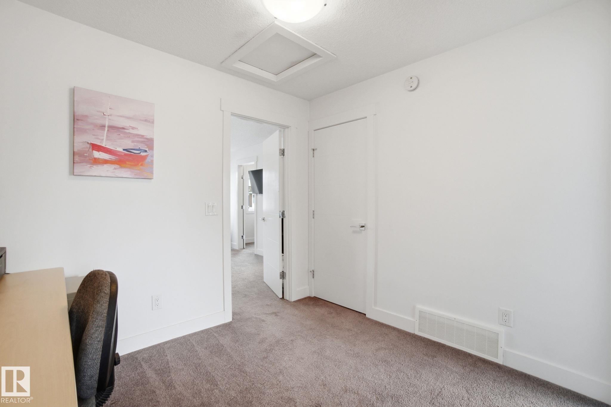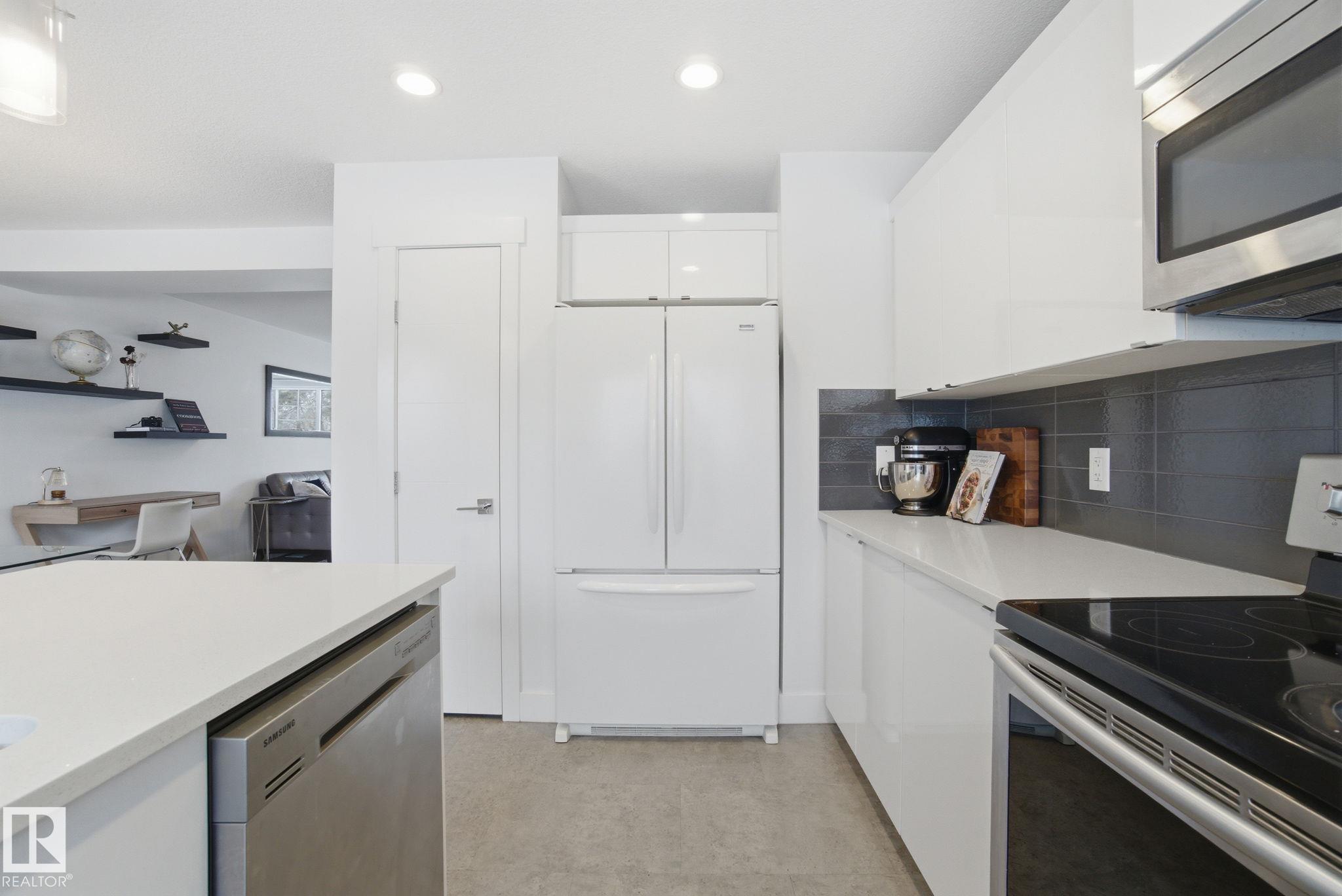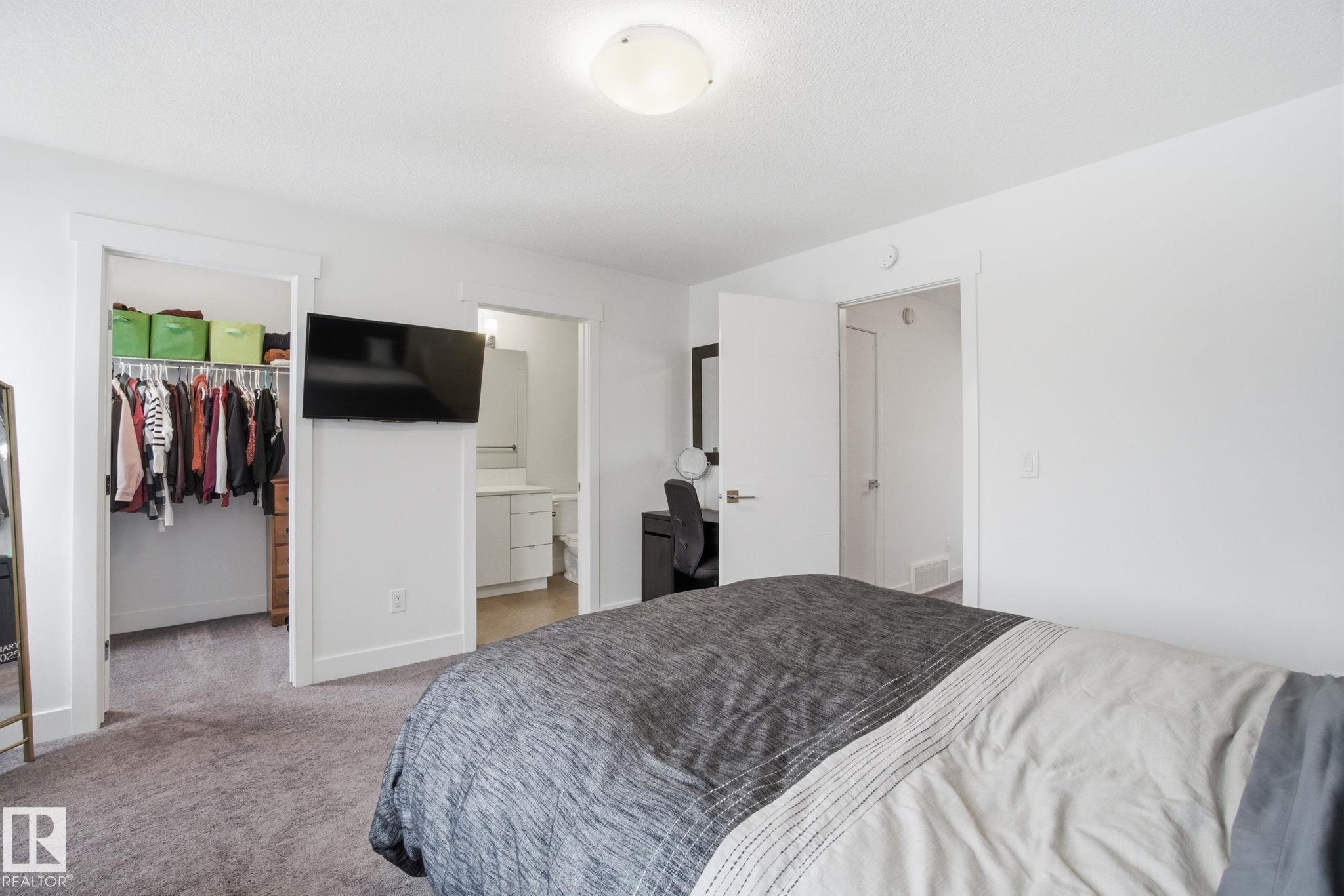 Stunning & impeccably maintained townhome perfectly positioned facing a beautiful stand of mature trees and just steps to Lois Hole Provincial Park, Big Lake, and The Enjoy Centre. The bright main floor showcases wide-plank laminate flooring, a convenient 2-piece bath with ceramic tile & a private balcony complete with gas BBQ hookup. The modern kitchen features sleek quartz countertops, stylish cabinetry and flows seamlessly into the open-concept living and dining area. Upstairs offers two spacious primary bedrooms, each with walk-in closets and their own full ensuite bathrooms. The lower level includes a welcoming entry from the double attached garage along with a dedicated laundry area with stacked washer and dryer. Additional highlights include triple pane windows and unbeatable access to scenic trails, wetlands, and Glendale Golf Club. Ideally located with quick access to St. Albert, Edmonton, and the Anthony Henday, this home offers the perfect blend of comfort, style and convenience!